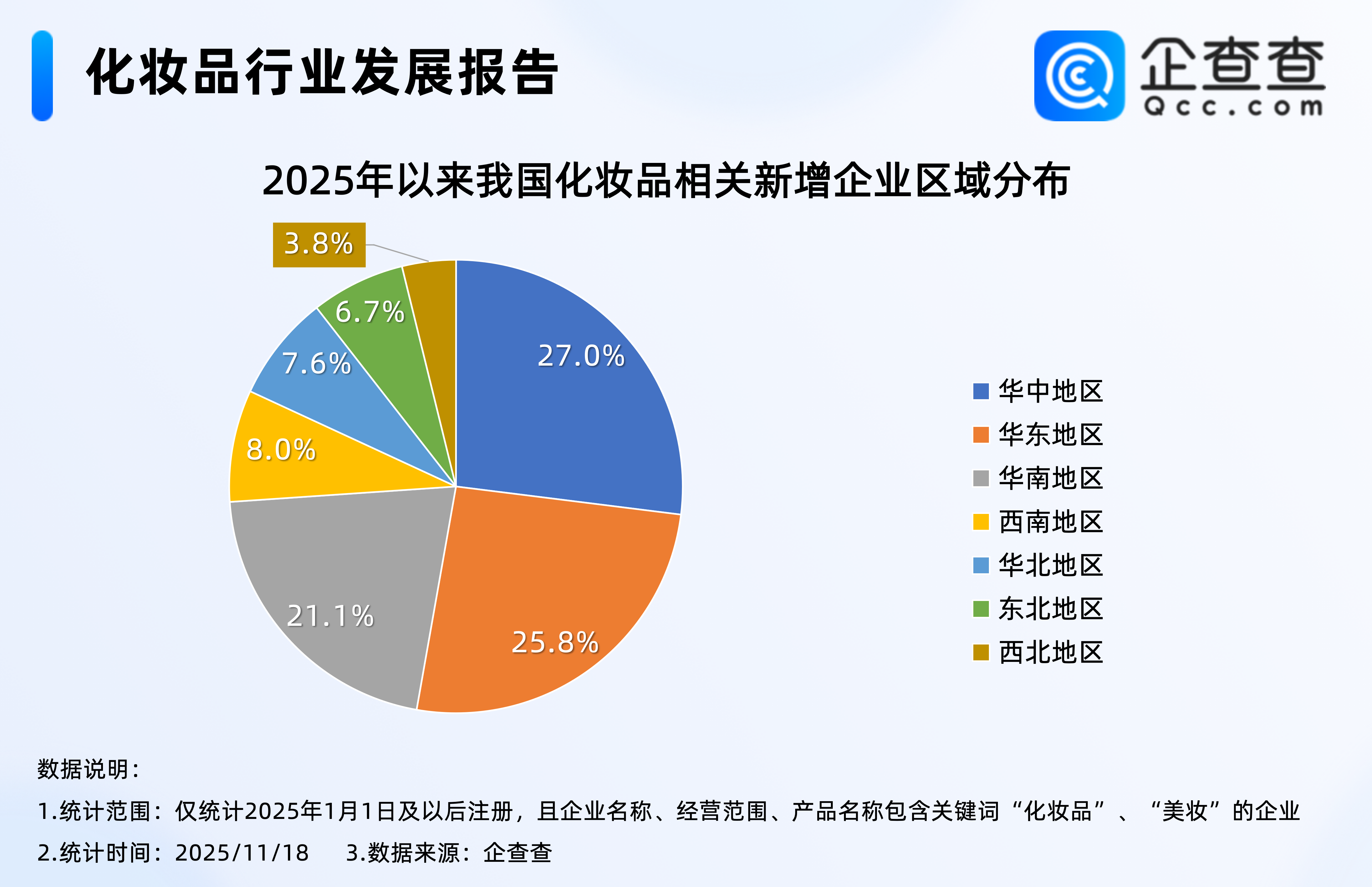 企查查数据显示,截至11月18日,2025年我国已注册424.9万家化妆品相关企业,区域分布上,分布在华中地区的今年新注册相关企业最多,占比达27%,占比超越华东地区、华南地区。