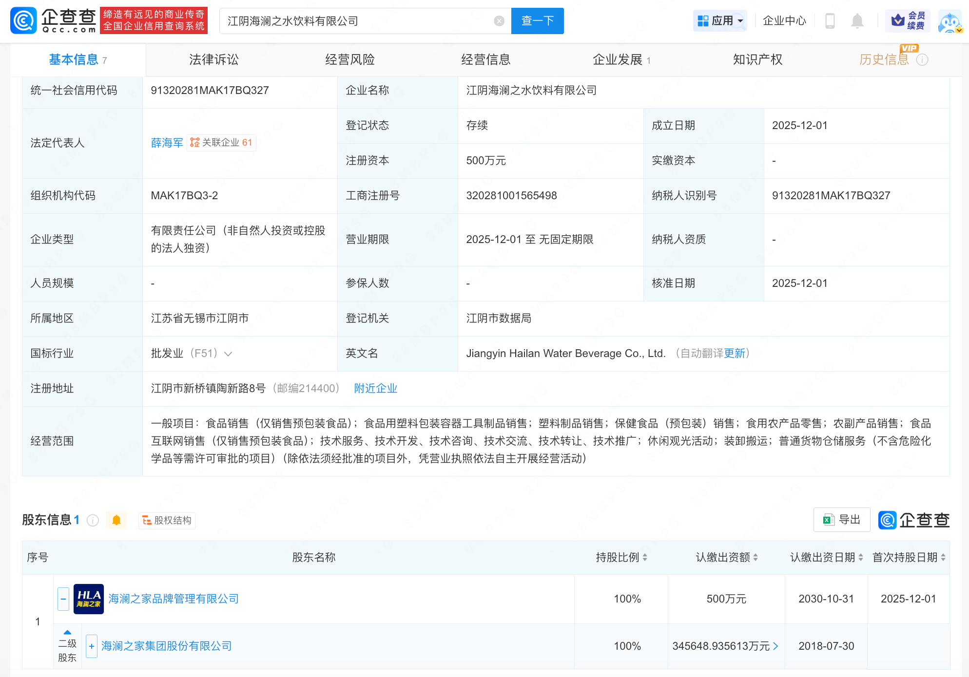 企查查APP显示,近日,江阴海澜之水饮料有限公司成立,法定代表人为薛海军,注册资本500万人民币,经营范围包括食品销售、食品用塑料包装容器工具制品销售、塑料制品销售、保健食品销售等。企查查股权穿透显示,该公司由海澜之家(600398)间接全资持股。
