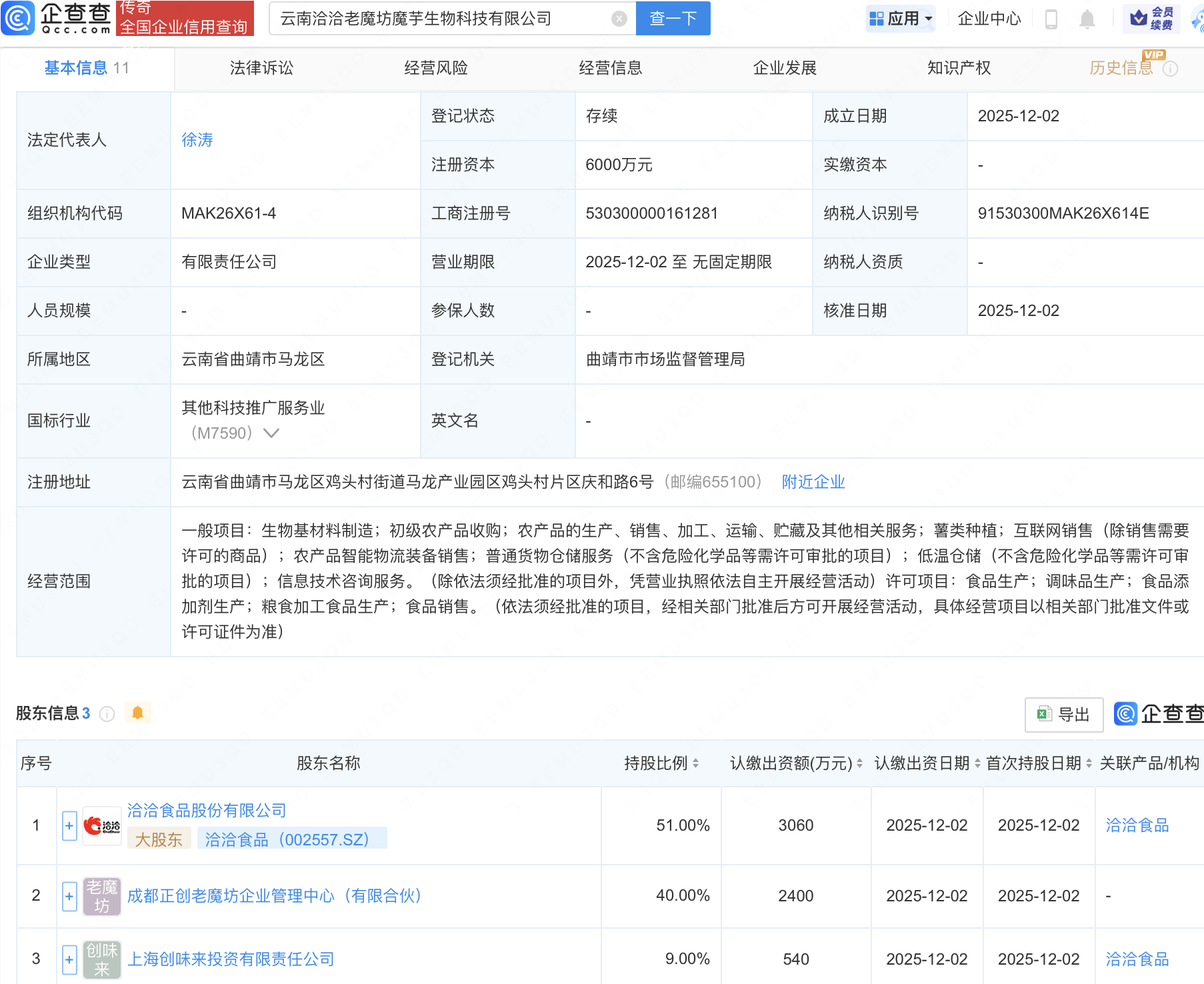 企查查APP显示,近日,云南洽洽老魔坊魔芋生物科技有限公司成立,注册资本6000万元,经营范围包含:生物基材料制造;初级农产品收购;农产品的生产、销售、加工、运输、贮藏及其他相关服务等。企查查股权穿透显示,该公司由洽洽食品(002557)等共同持股。