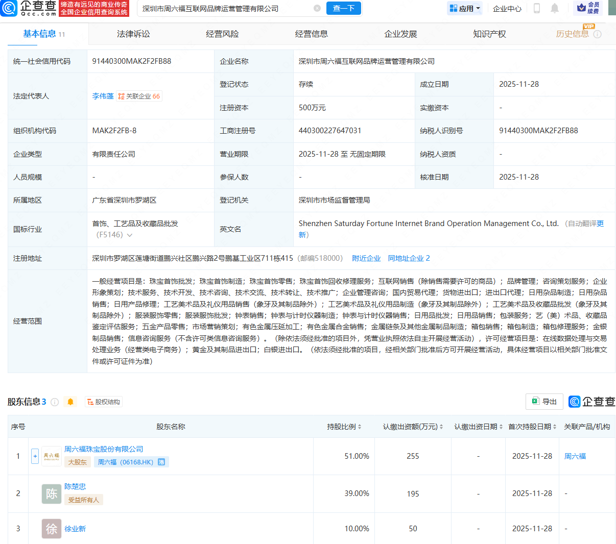 企查查APP显示,近日,深圳市周六福互联网品牌运营管理有限公司成立,法定代表人为李伟蓬,经营范围包含:珠宝首饰批发;珠宝首饰制造;珠宝首饰回收修理服务;互联网销售(除销售需要许可的商品);品牌管理等。企查查股权穿透显示,该公司由周六福(06168.HK)、陈楚忠等共同持股。
