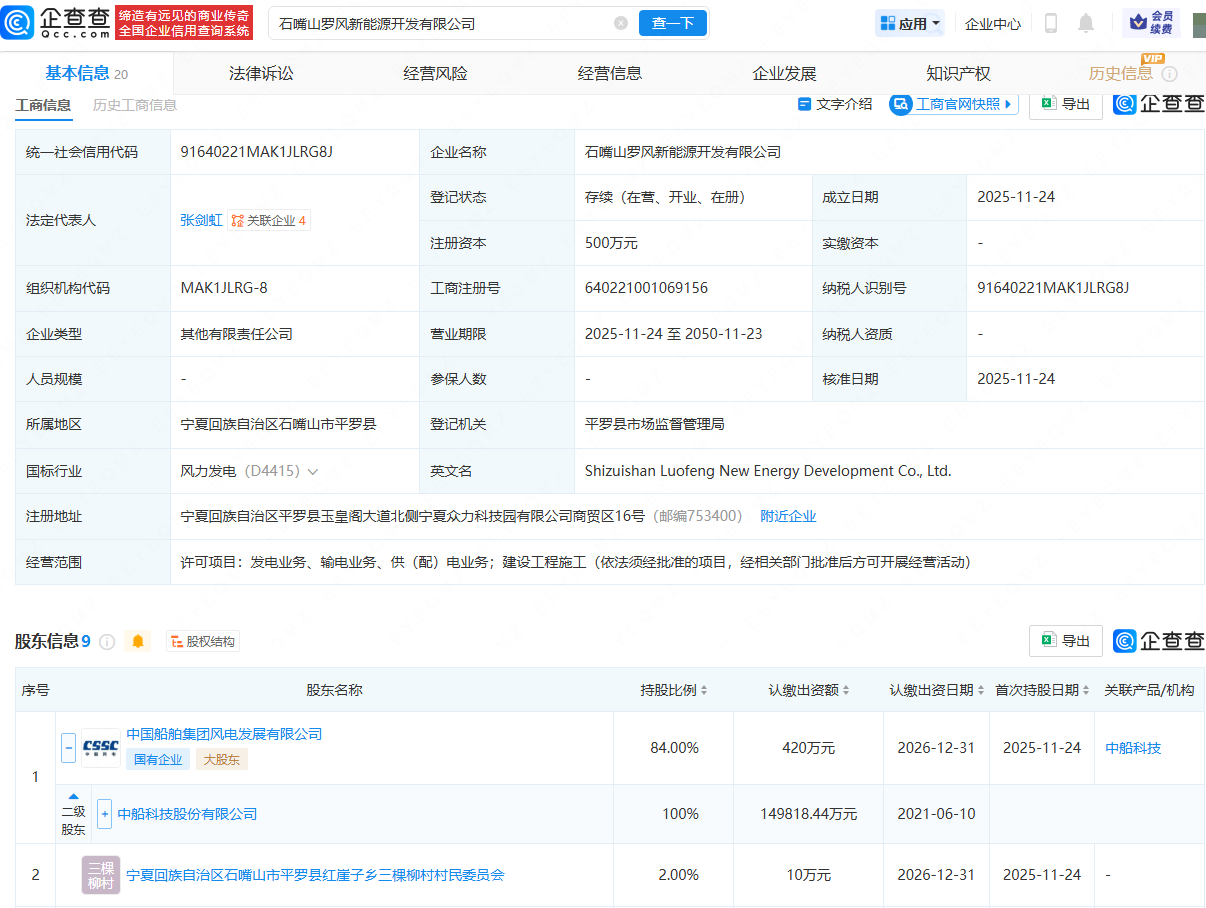 企查查APP显示,近日,石嘴山罗风新能源开发有限公司成立,法定代表人为张剑虹,经营范围包含:发电业务、输电业务、供(配)电业务;建设工程施工。企查查股权穿透显示,该公司由中船科技(600072)全资子公司中国船舶集团风电发展有限公司等共同持股。