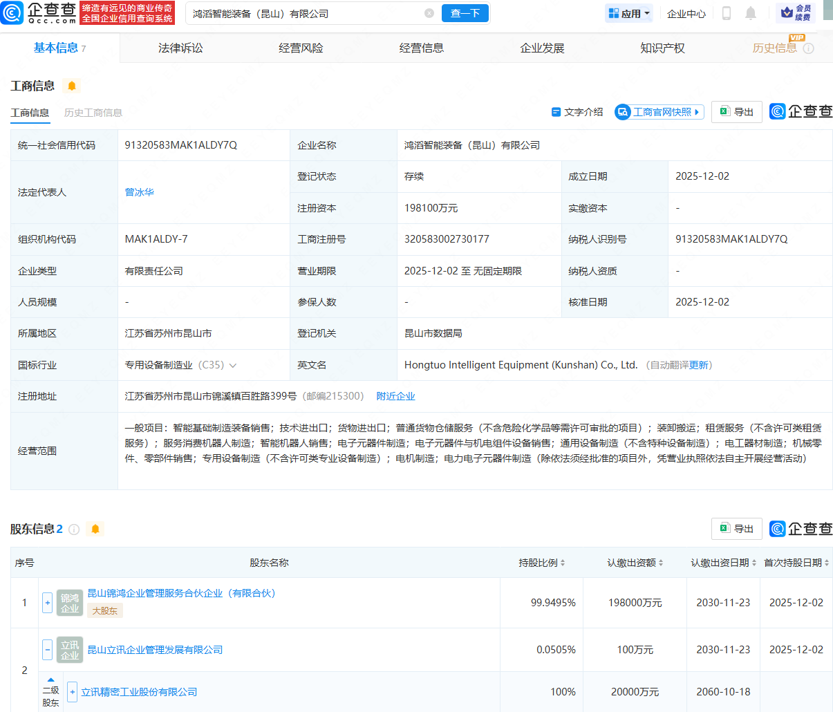 企查查APP显示,近日,鸿滔智能装备(昆山)有限公司成立,法定代表人为曾冰华,注册资本为19.81亿元,经营范围包含:智能基础制造装备销售;服务消费机器人制造;智能机器人销售;电子元器件制造等。企查查股权穿透显示,该公司由昆山锦鸿企业管理服务合伙企业(有限合伙)、立讯精密(002475)全资子公司昆山立讯企业管理发展有限公司共同持股。