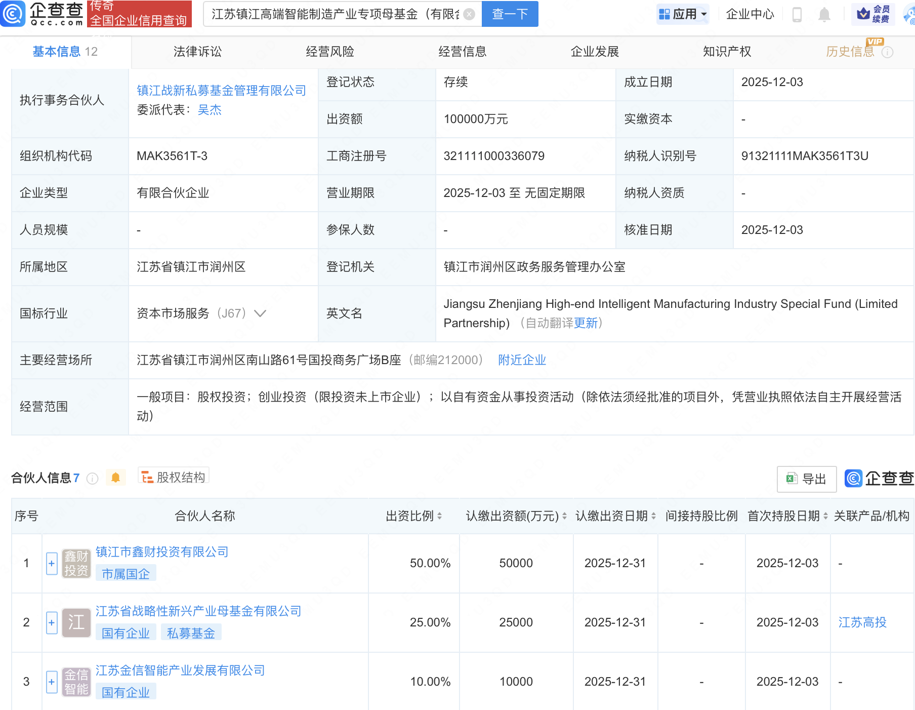 企查查APP显示,近日,江苏镇江高端智能制造产业专项母基金(有限合伙)成立,出资额10亿元,经营范围包含:股权投资;创业投资(限投资未上市企业);以自有资金从事投资活动。企查查股权穿透显示,该企业由江苏省战略性新兴产业母基金有限公司等共同出资。
