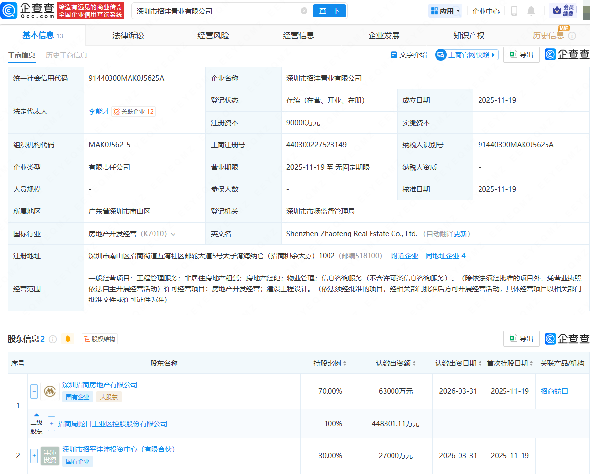 企查查APP显示,近日,深圳市招沣置业有限公司成立,法定代表人为李能才,注册资本为9亿元,经营范围包含:工程管理服务;非居住房地产租赁;房地产经纪;物业管理;信息咨询服务等。企查查股权穿透显示,该公司由招商蛇口(001979)全资子公司深圳招商房地产有限公司、深圳市招平沣沛投资中心(有限合伙)共同持股。