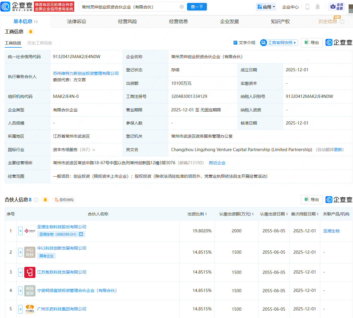企查查APP显示,近日,常州灵仲创业投资合伙企业(有限合伙)成立,出资额约1亿元,经营范围包含:创业投资(限投资未上市企业);股权投资。企查查股权穿透显示,该合伙企业由圣湘生物(688289)、江苏鱼跃科技发展有限公司等共同持股。