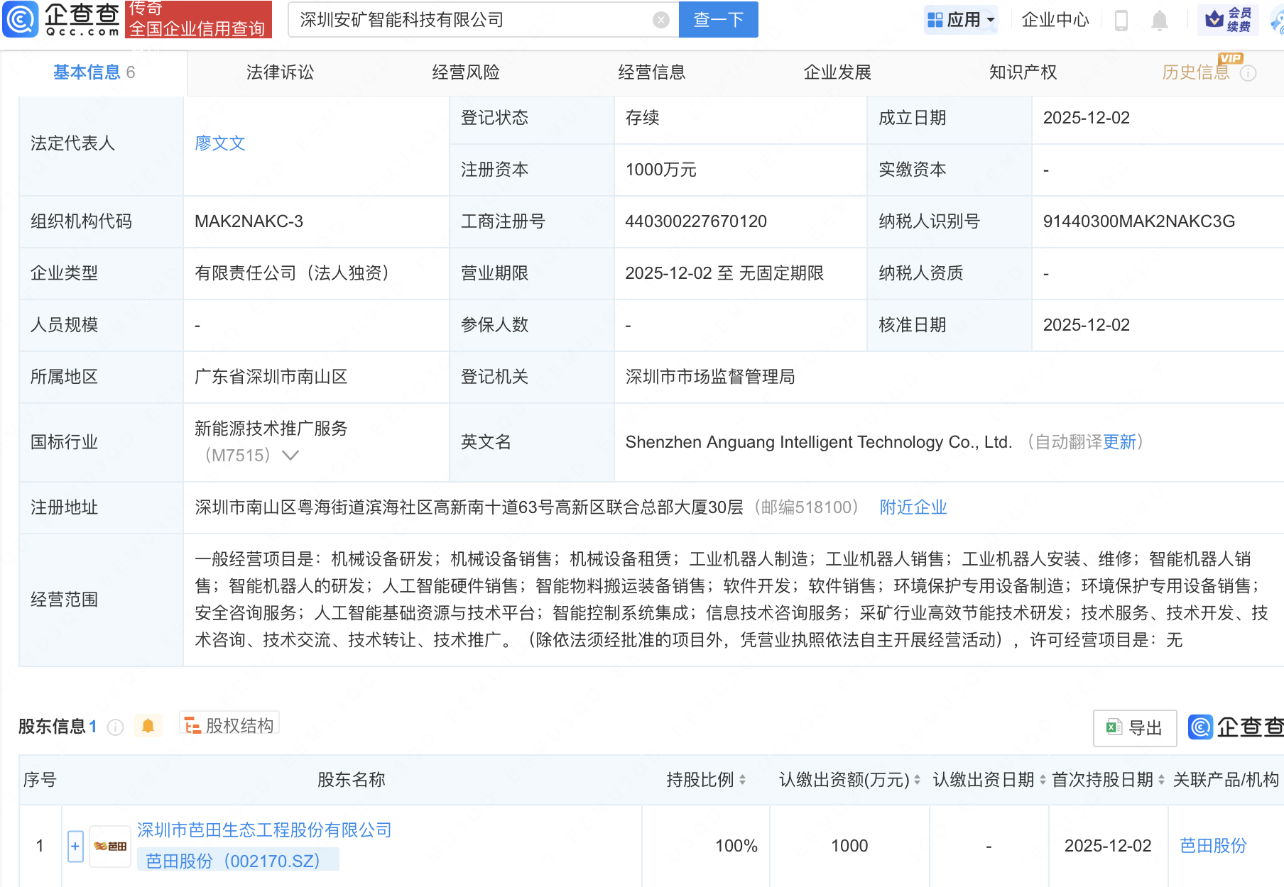 企查查APP显示,近日,深圳安矿智能科技有限公司成立,注册资本1000万元,经营范围包含:智能机器人销售;智能机器人的研发;人工智能硬件销售;智能物料搬运装备销售等。企查查股权穿透显示,该公司由芭田股份(002170)全资持股。