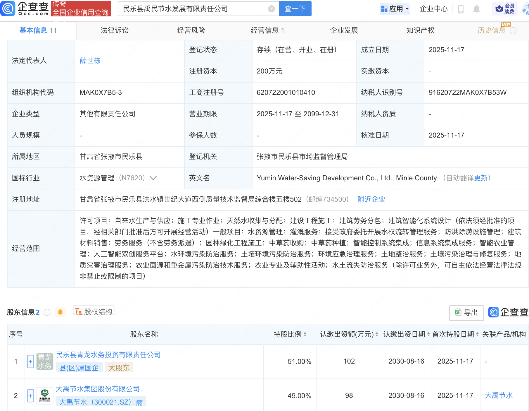 企查查APP显示,近日,民乐县禹民节水发展有限责任公司成立,经营范围包含:智能控制系统集成;信息系统集成服务;智能农业管理;人工智能双创服务平台等。企查查股权穿透显示,该公司由大禹节水(300021)等共同持股。