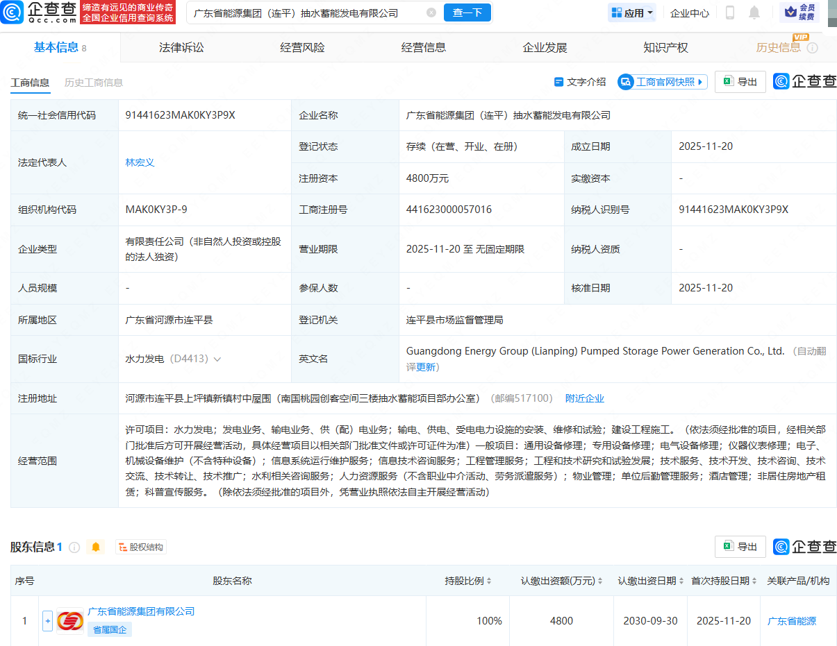 企查查APP显示,近日,广东省能源集团(连平)抽水蓄能发电有限公司成立,法定代表人为林宏义,注册资本为4800万元,经营范围包含:水力发电;发电业务、输电业务、供(配)电业务;专用设备修理;电气设备修理。企查查股权穿透显示,该公司由广东省能源集团有限公司全资持股。