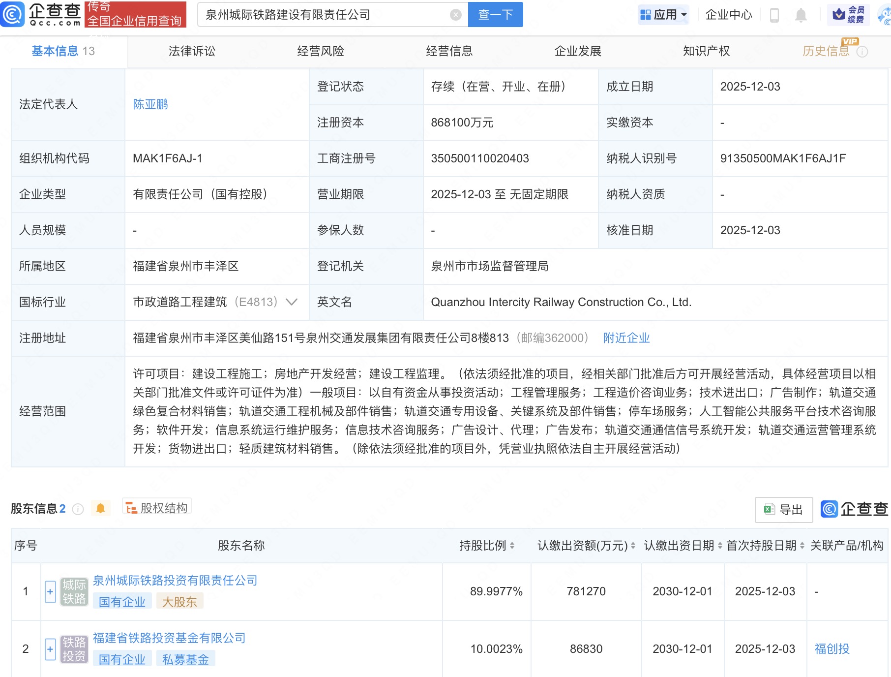 企查查APP显示,近日,泉州城际铁路建设有限责任公司成立,法定代表人为陈亚鹏,注册资本86.81亿人民币,经营范围包括建设工程施工、房地产开发经营、建设工程监理、以自有资金从事投资活动等。企查查股权穿透显示,该公司由泉州城际铁路投资有限责任公司、福建省铁路投资基金有限公司共同持股。
