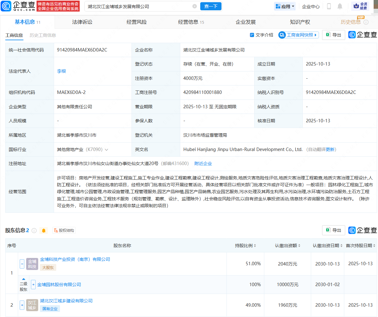 企查查APP显示,湖北汉江金埔城乡发展有限公司成立,法定代表人为李根,注册资本为4000万元,经营范围包含:房地产开发经营;建设工程施工;测绘服务;地质灾害危险性评估;园林绿化工程施工等。企查查股权穿透显示,该公司由金埔园林(301098)全资子公司金埔科技产业投资(南京)有限公司、湖北汉江城乡建设有限公司共同持股。