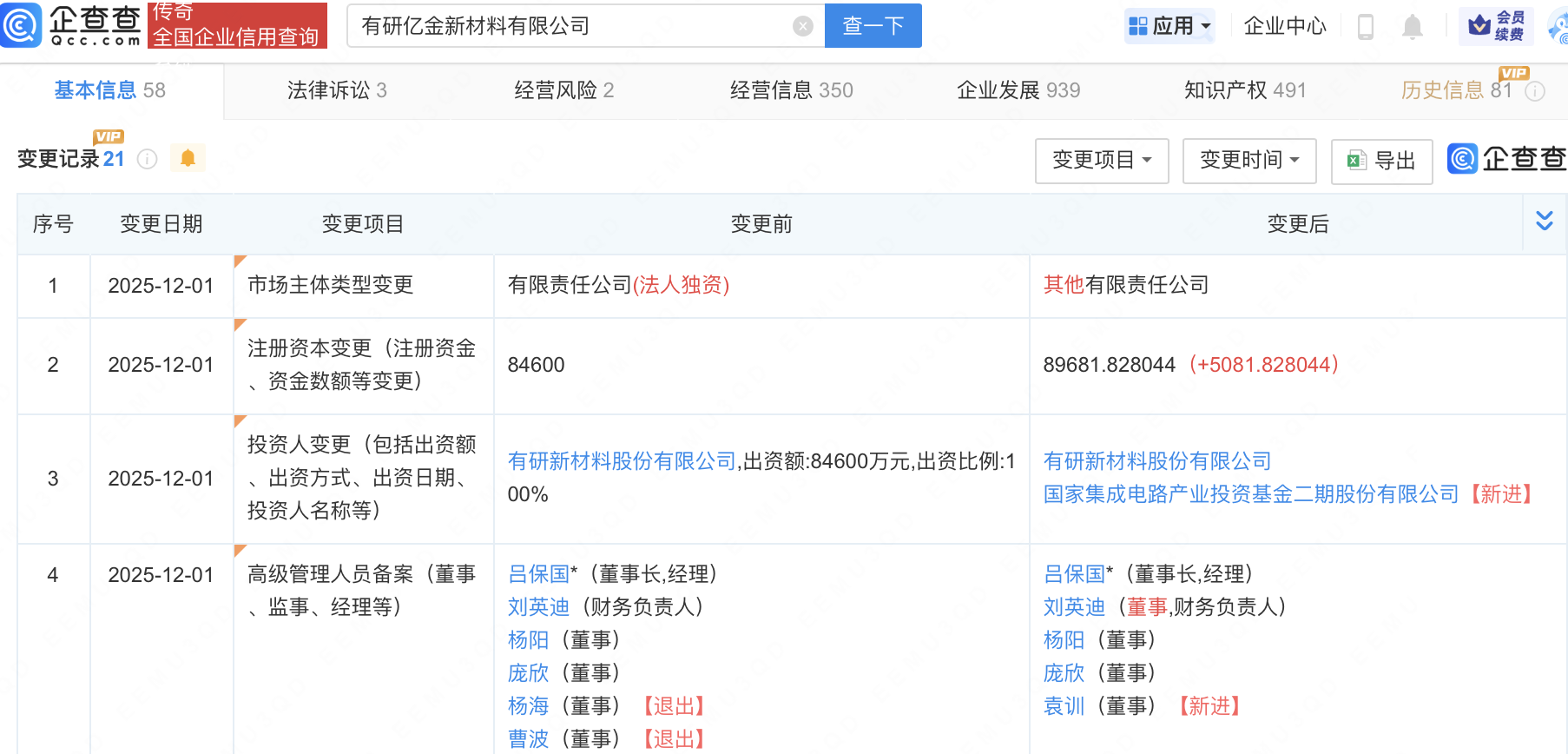 企查查APP显示,近日,有研亿金新材料有限公司发生工商变更,新增国家集成电路产业投资基金二期股份有限公司为股东,同时注册资本增至8.97亿元。此前,该公司由有研新材(600206)100%持股。企查查信息显示,该公司成立于2000年,经营范围包含:有色金属材料及制品的销售;进出口业务;稀有及贵金属的技术咨询、技术开发、技术转让、技术服务等。据其官网,有研亿金专注于高纯薄膜材料、稀贵金属功能材料和铂族金属材料的研发、生产与销售。