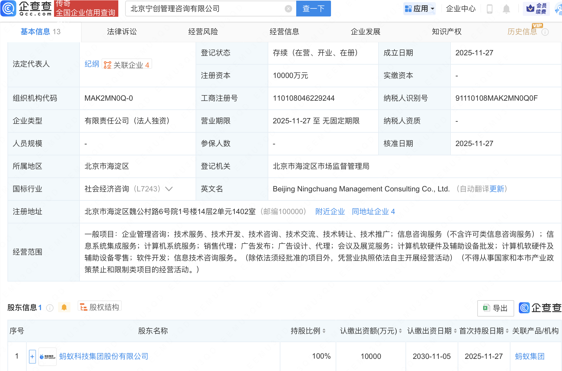 企查查APP显示,近日,北京宁创管理咨询有限公司成立,注册资本1亿元,经营范围包含:计算机软硬件及辅助设备零售;软件开发;信息技术咨询服务等。企查查股权穿透显示,该公司由蚂蚁科技集团股份有限公司全资持股。