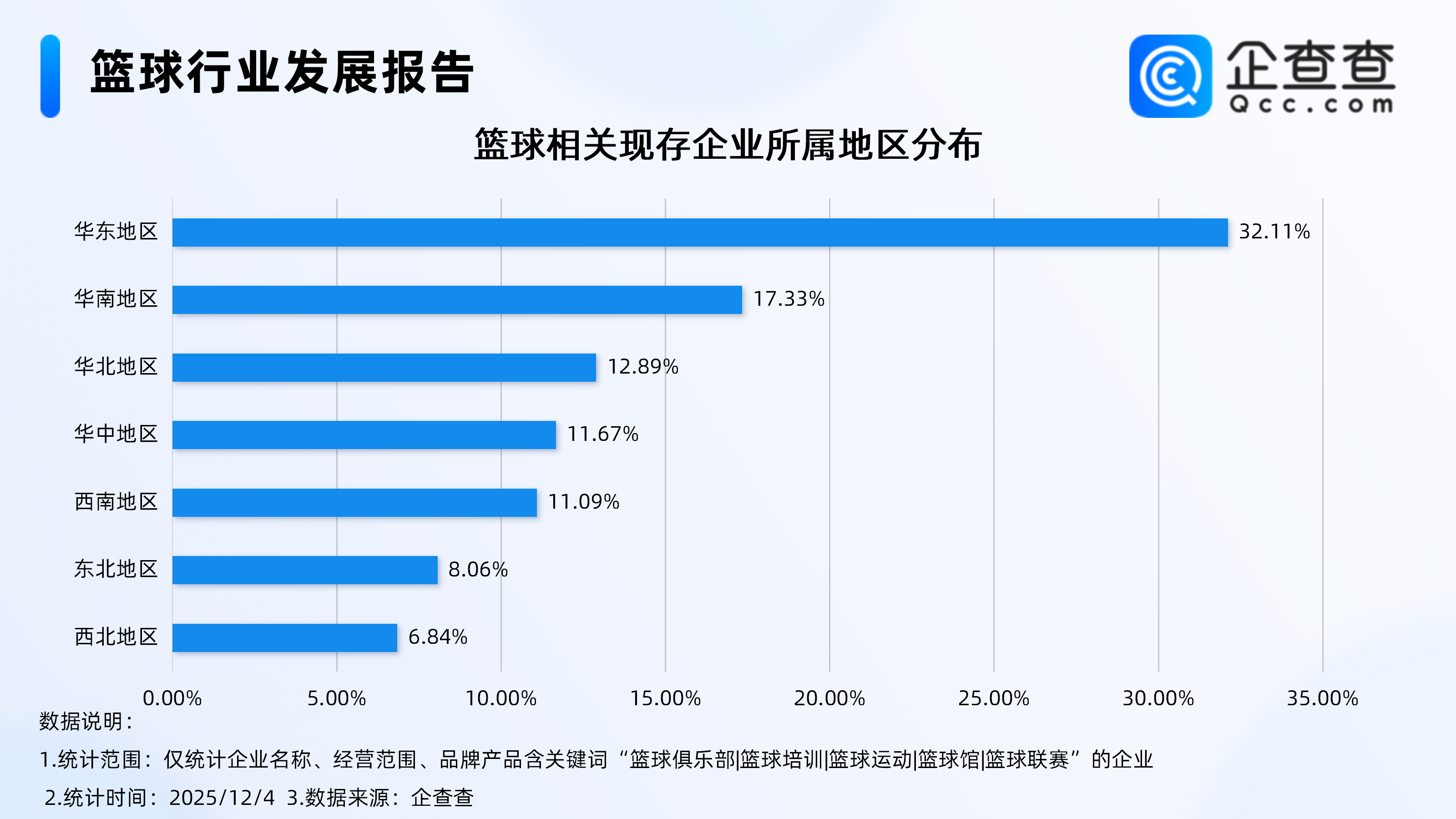 企查查数据显示,截至12月4日,国内篮球相关企业现存量达1.03万家,主要分布在华东地区,占比达32.11%,其次为分布在华南地区的相关企业,占比达17.33%。分布在华北、华中、西南这三个地区的相关企业量相对均衡,占比均在11%-13%之间。