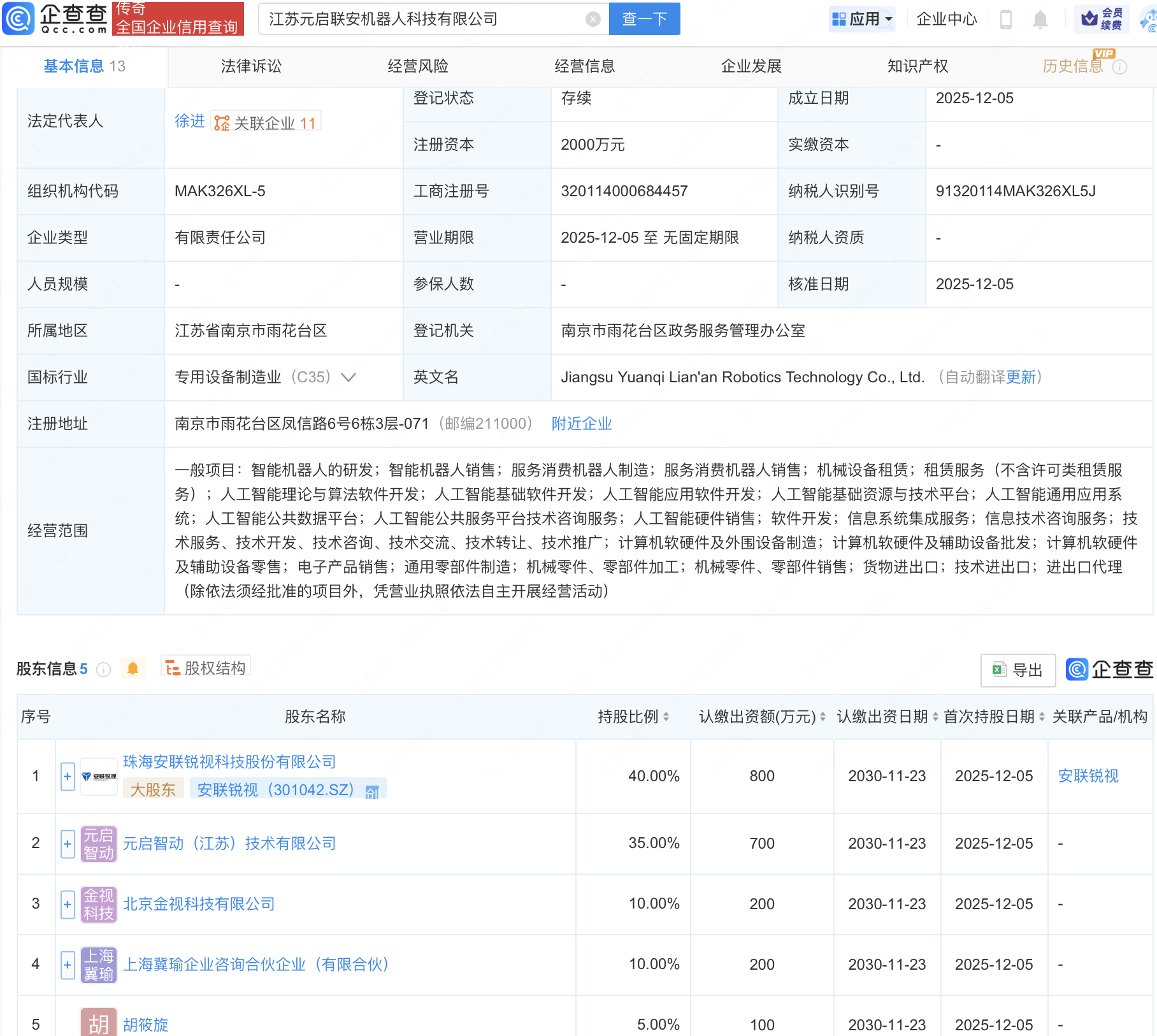 企查查APP显示,近日,江苏元启联安机器人科技有限公司成立,注册资本2000万元,经营范围包含:智能机器人的研发;智能机器人销售;人工智能基础软件开发;人工智能应用软件开发;人工智能基础资源与技术平台等。企查查股权穿透显示,该公司由安联锐视(301042)等共同持股。