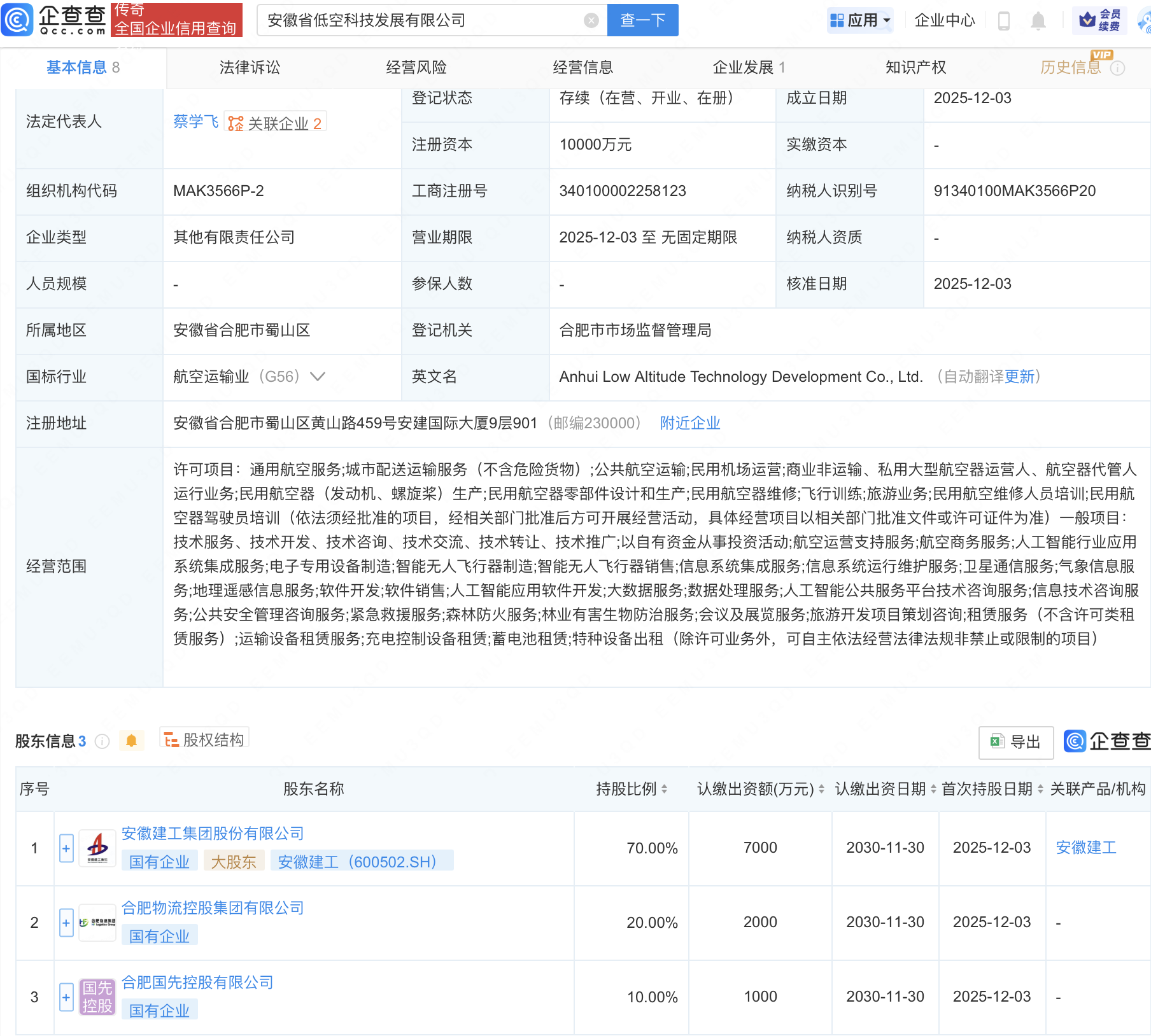 企查查APP显示,近日,安徽省低空科技发展有限公司成立,注册资本1亿元,经营范围包含:民用航空器零部件设计和生产;智能无人飞行器制造;人工智能应用软件开发;人工智能公共服务平台技术咨询服务等。企查查股权穿透显示,该公司由安徽建工(600502)等共同持股。