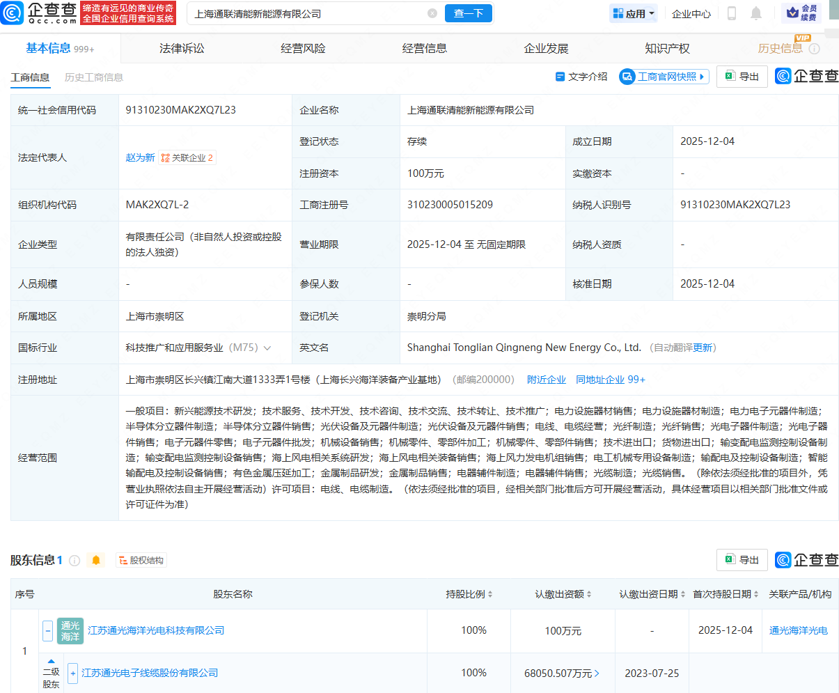 企查查APP显示,近日,上海通联清能新能源有限公司成立,法定代表人为赵为新,经营范围包含:电力设施器材销售;电力电子元器件制造;半导体分立器件制造;半导体分立器件销售;电线、电缆经营;光纤制造等。企查查股权穿透显示,该公司由通光线缆(300265)间接全资持股。