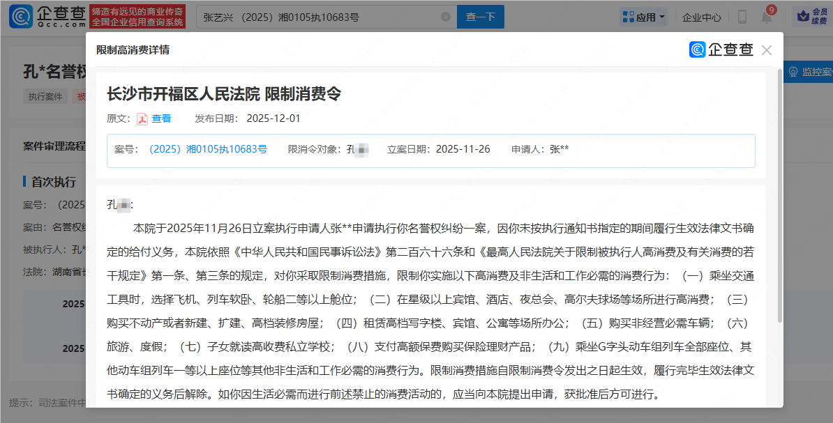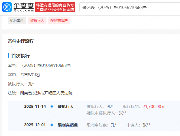 企查查APP显示,近日,被告孔某被法院签发限制消费令,申请人为张艺兴。案件流程显示,今年11月14日,孔某已因该起名誉权纠纷案件被法院强制执行21700元。
