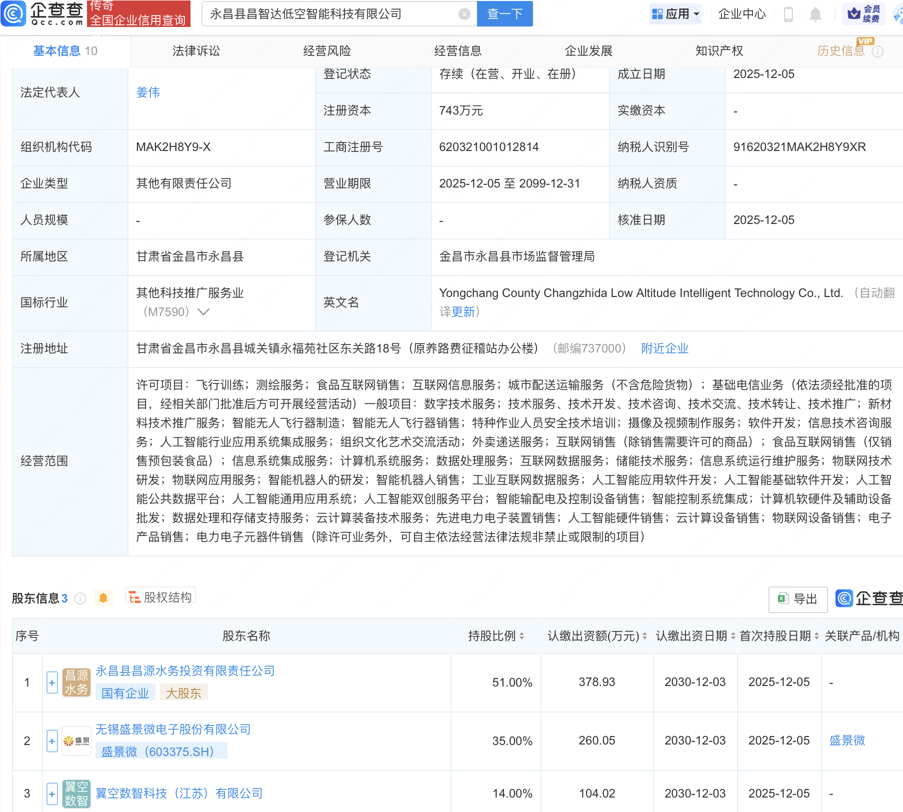 企查查APP显示,近日,永昌县昌智达低空智能科技有限公司成立,经营范围包含:智能无人飞行器制造;人工智能基础软件开发;人工智能公共数据平台;人工智能通用应用系统等。企查查股权穿透显示,该公司由盛景微(603375)等共同持股。