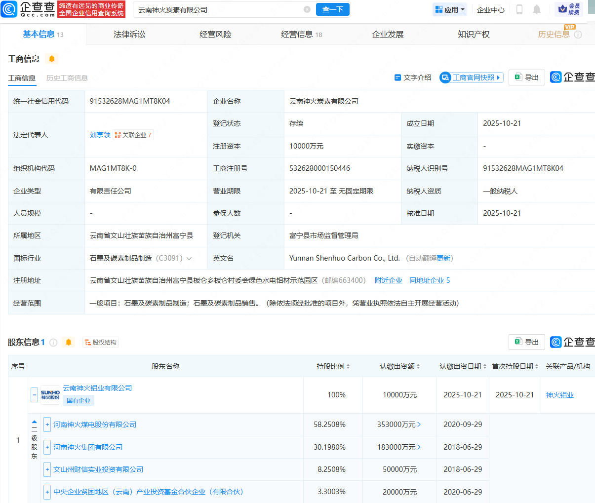 企查查APP显示,近日,云南神火炭素有限公司成立,法定代表人为刘京领,注册资本为1亿元,经营范围包含:石墨及碳素制品制造;石墨及碳素制品销售。企查查股权穿透显示,该公司由神火股份(000933)旗下云南神火铝业有限公司全资持股。