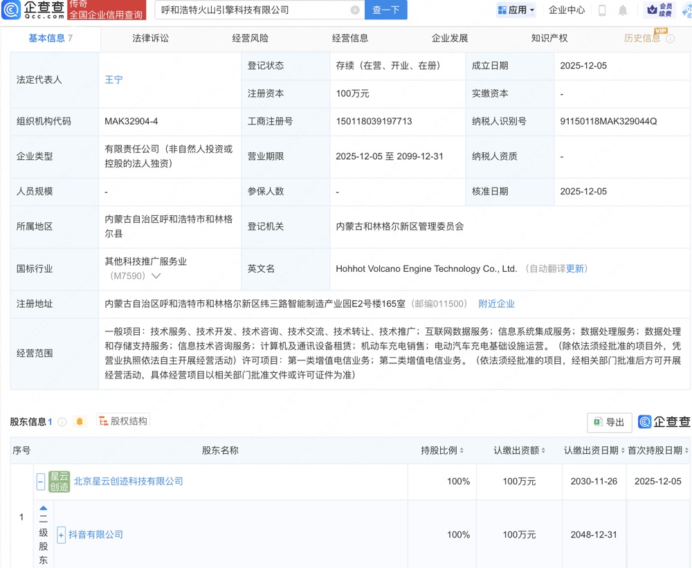 企查查APP显示,近日,呼和浩特火山引擎科技有限公司成立,法定代表人为王宁,经营范围含信息技术咨询服务;计算机及通讯设备租赁;机动车充电销售;电动汽车充电基础设施运营等。企查查股权穿透显示,该公司由抖音有限公司间接全资持股。