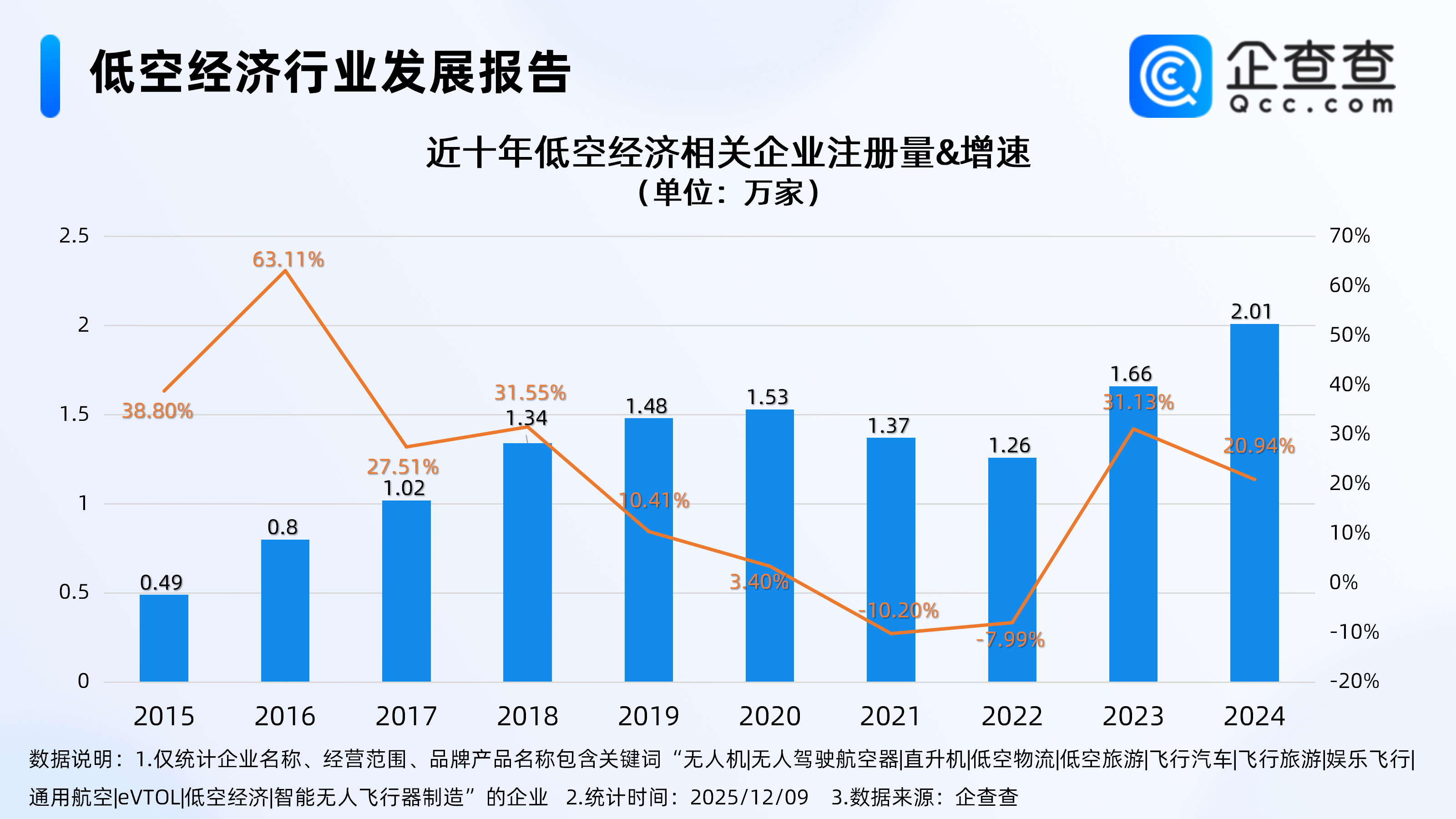 企查查数据显示,截至12月9日,国内现存低空经济相关企业15.43万家。近十年相关企业注册量呈整体增长态势,2024年注册量首次突破2万家,全年注册2.01万家相关企业,同比增长20.94%。截至目前,今年已注册4.43万家相关企业,其中前11月注册4.29万家,同比增长152.94%。