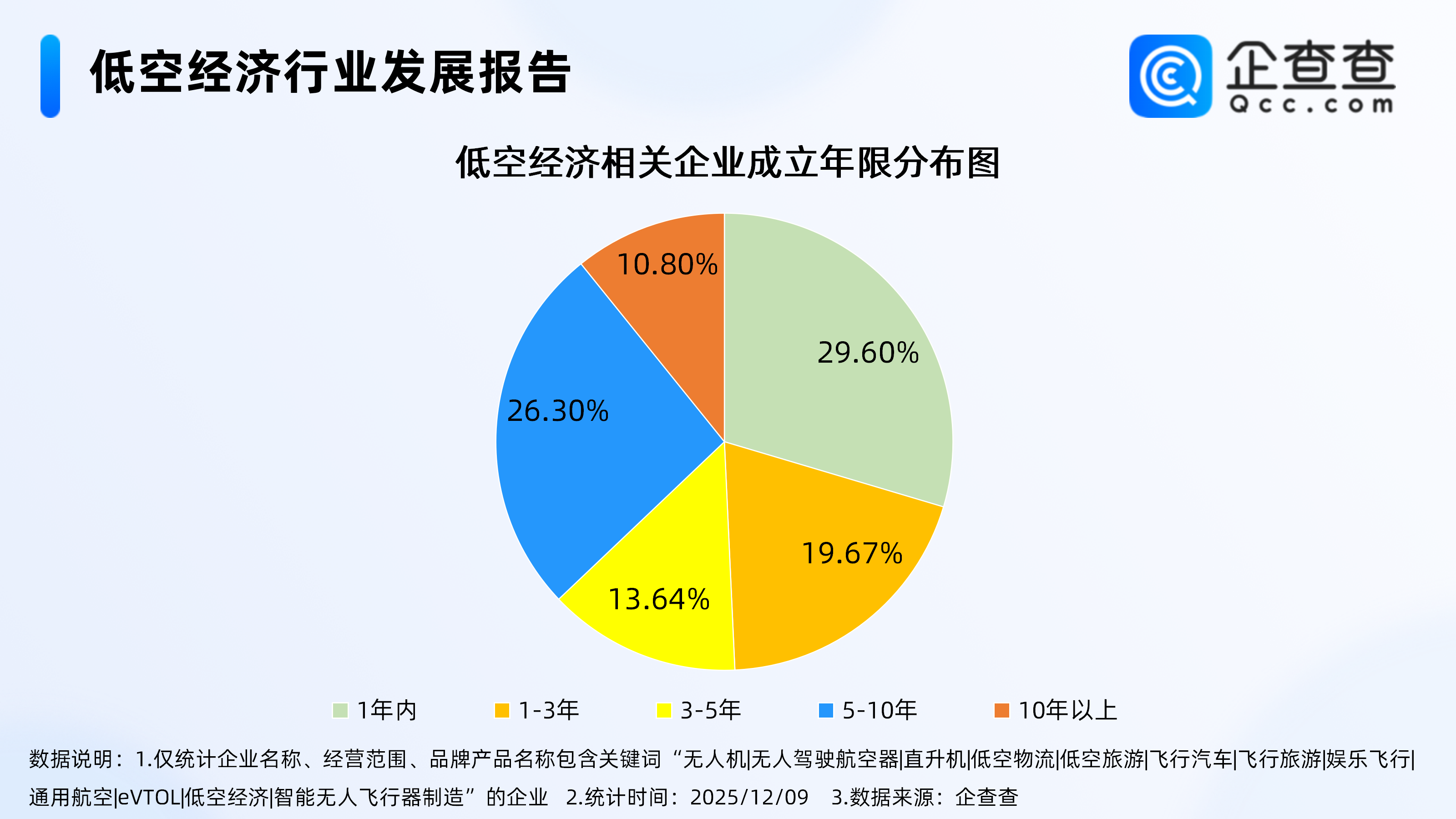 企查查数据显示,从经营时间来看,成立年限在1年内的低空经济相关现存企业最多,占比29.60%。其次,成立年限在5-10年的相关企业占比26.30%。成立年限在10年以上的相关企业占比10.80%。