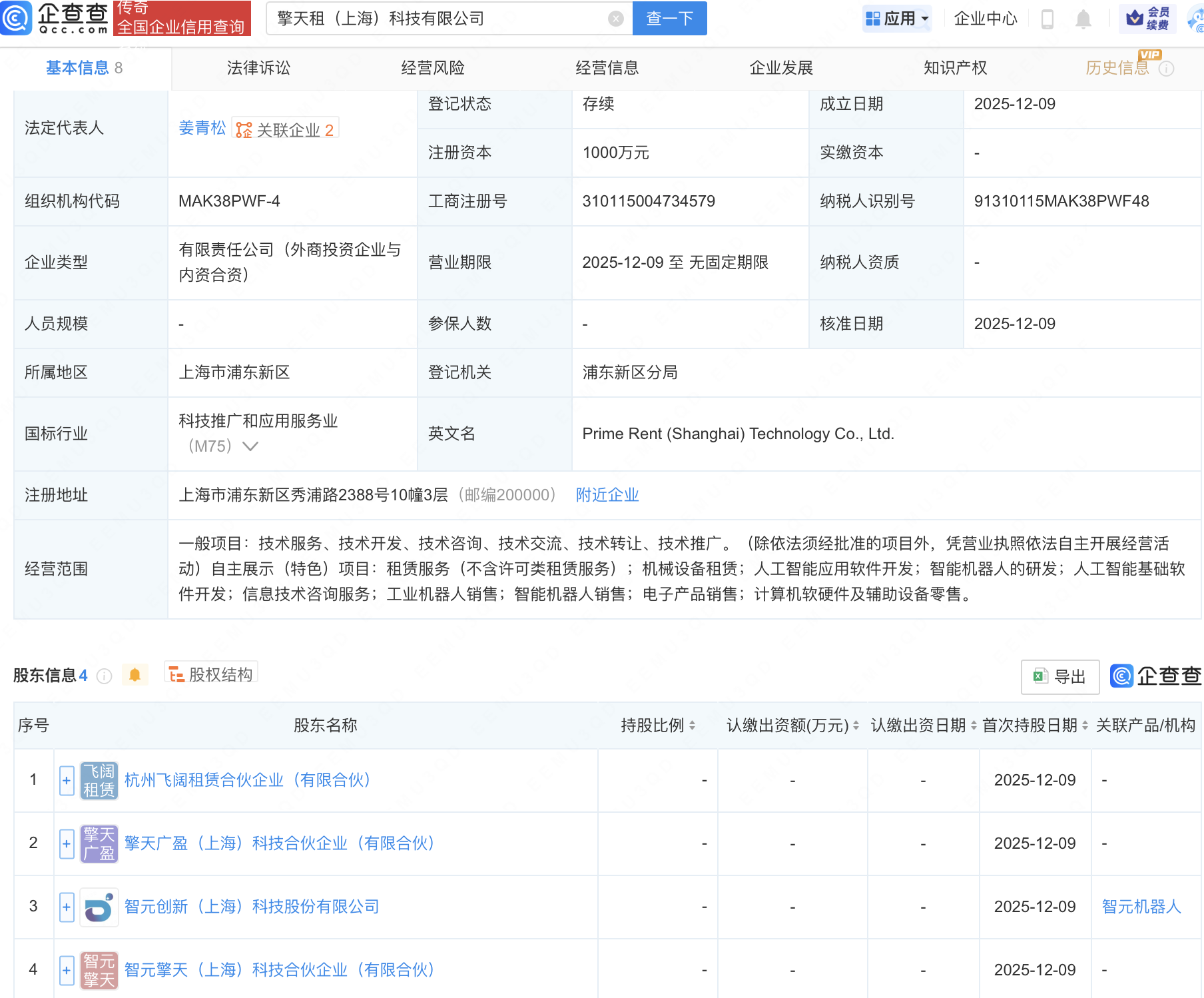 企查查APP显示,近日,擎天租(上海)科技有限公司成立,注册资本1000万元,经营范围包含:人工智能应用软件开发;智能机器人的研发;人工智能基础软件开发;信息技术咨询服务;工业机器人销售等。企查查股权穿透显示,该公司由智元机器人关联公司智元创新(上海)科技股份有限公司等共同持股。