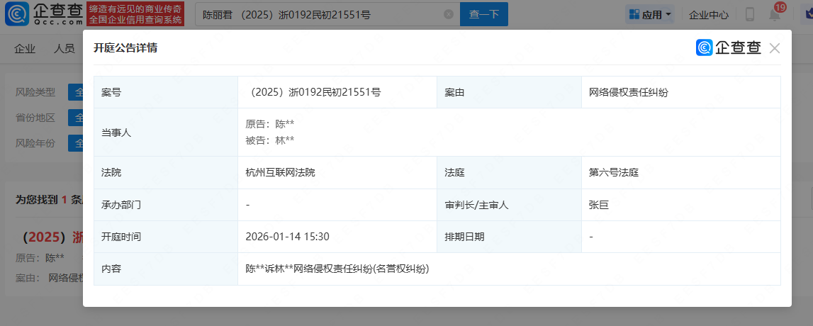 企查查APP显示,近日,法院刊登陈丽君起诉林某某网络侵权责任纠纷(名誉权纠纷)案件开庭公告。公告显示,该起案件计划将于2026年1月14日在杭州互联网法院开庭审理。此前,陈丽君方律师发布维权案件进度汇总表,多起案件待法院开庭。