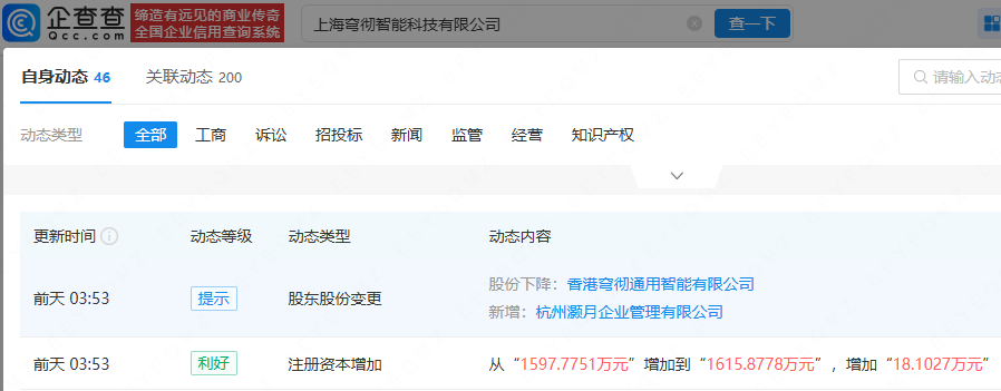 企查查APP显示,近日,上海穹彻智能科技有限公司发生工商变更,注册资本增加至约1615.88万元,新增阿里巴巴旗下杭州灏月企业管理有限公司为股东。