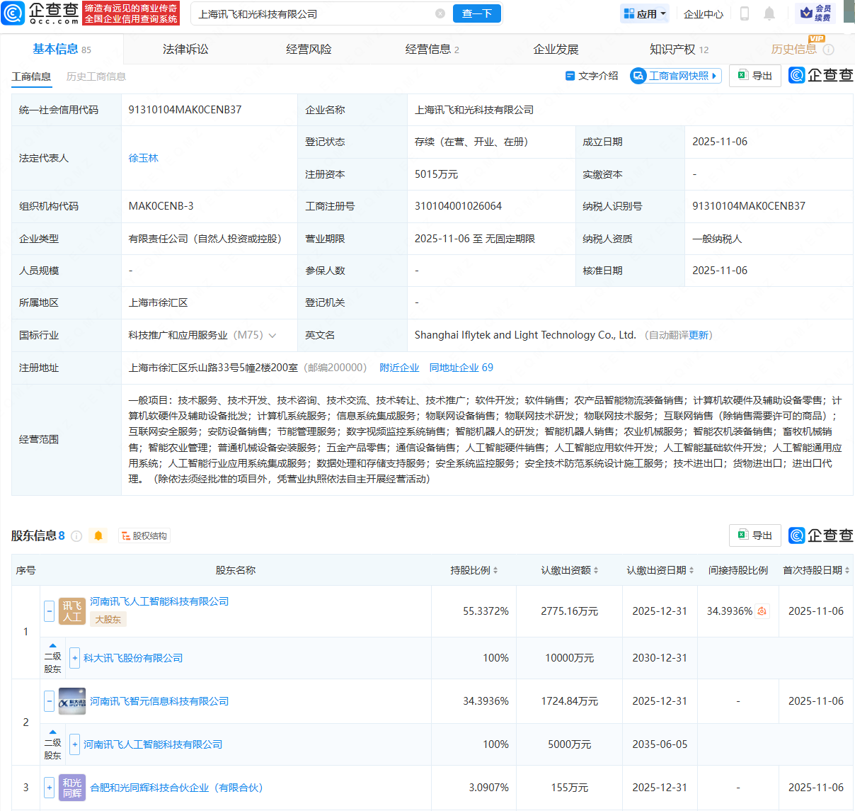 企查查APP显示,近日,上海讯飞和光科技有限公司成立,法定代表人为徐玉林,注册资本为5015万元,经营范围包含:农产品智能物流装备销售;智能机器人的研发;智能机器人销售;农业机械服务;人工智能硬件销售等。企查查股权穿透显示,该公司由科大讯飞(002230)全资子公司河南讯飞人工智能科技有限公司、河南讯飞智元信息科技有限公司等共同持股。