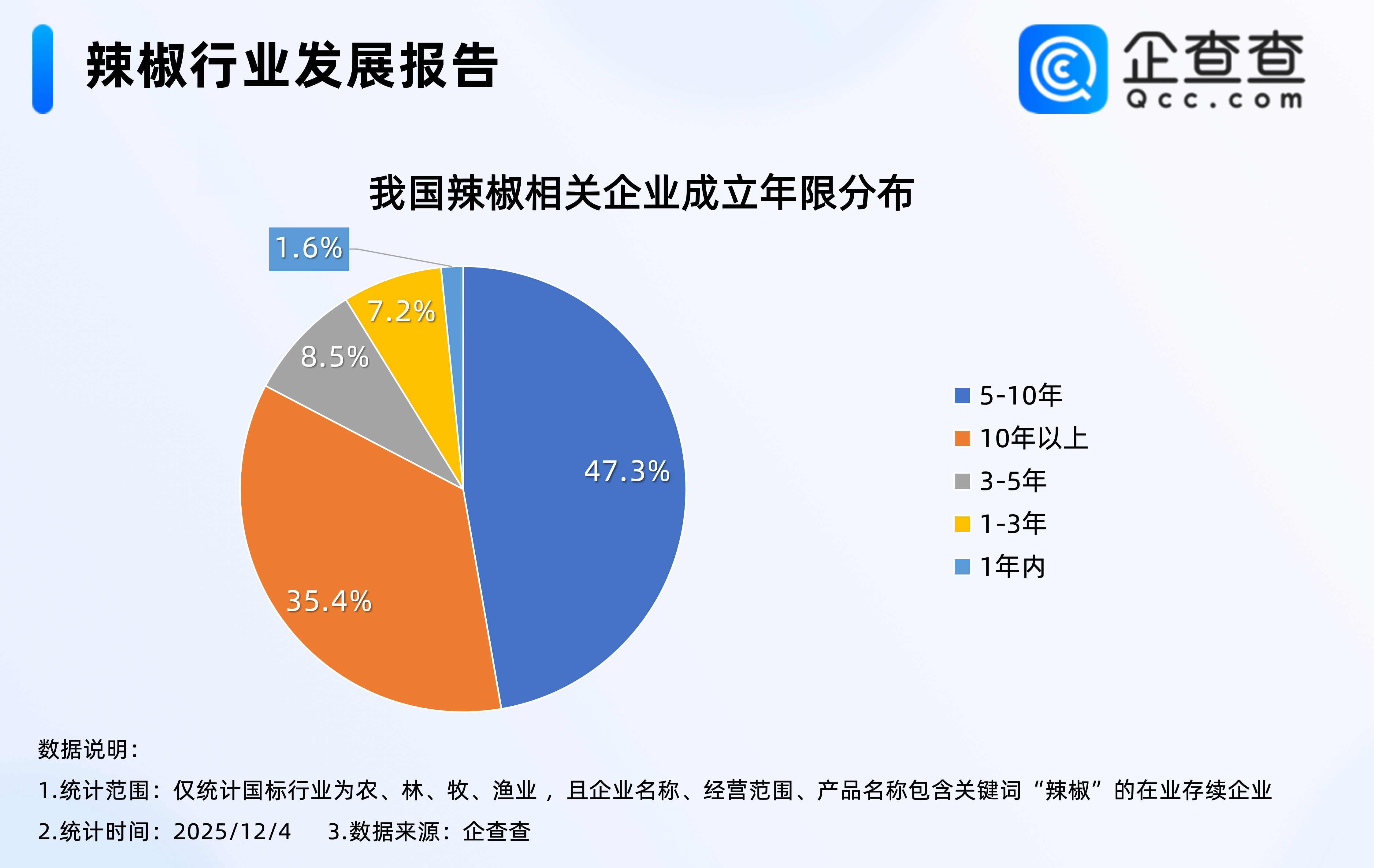 企查查数据显示,成立年限上,我国辣椒领域以老牌企业为主,超八成辣椒相关企业成立5年以上,其中成立超10年的企业占比35.4%。