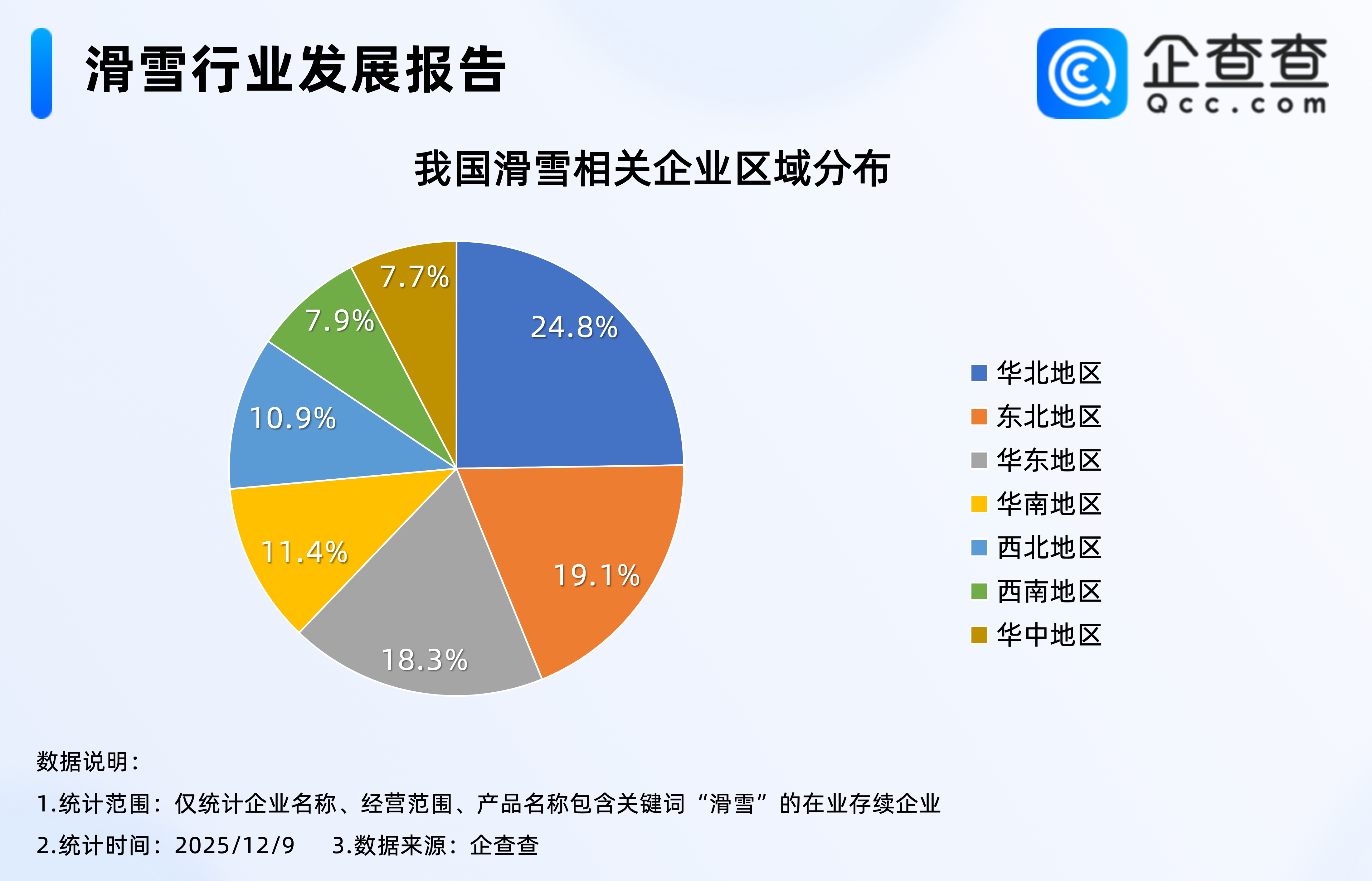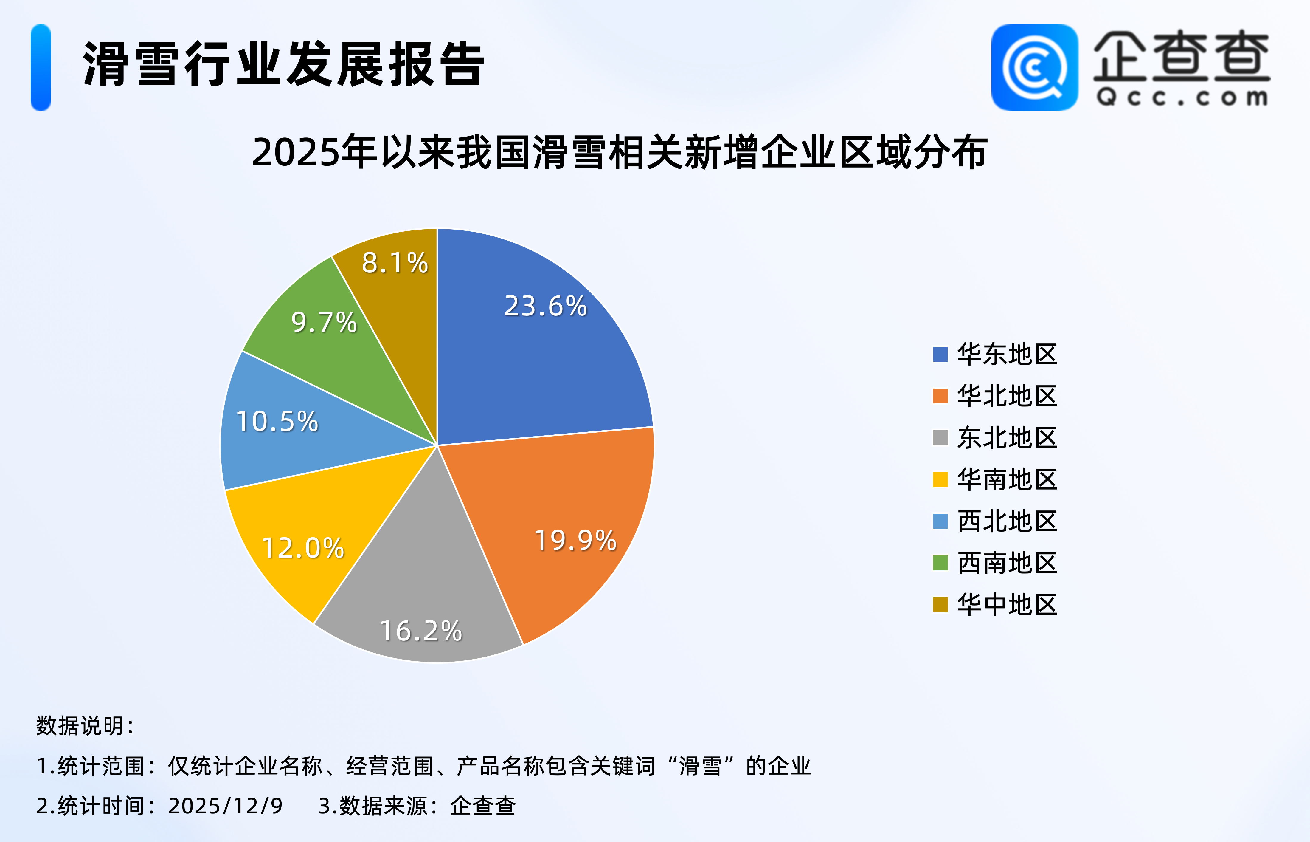 企查查数据显示,截至12月9日,我国现存1.3万家滑雪相关企业,其中分布在华北地区的相关企业最多,占比达24.8%;注册量方面,2025年以来,我国已注册2309家滑雪相关企业,相比2024年同期增加10.7%,区域分布上,华东地区凭借占比23.6%,成为2025年以来滑雪相关企业注册量最大的区域。