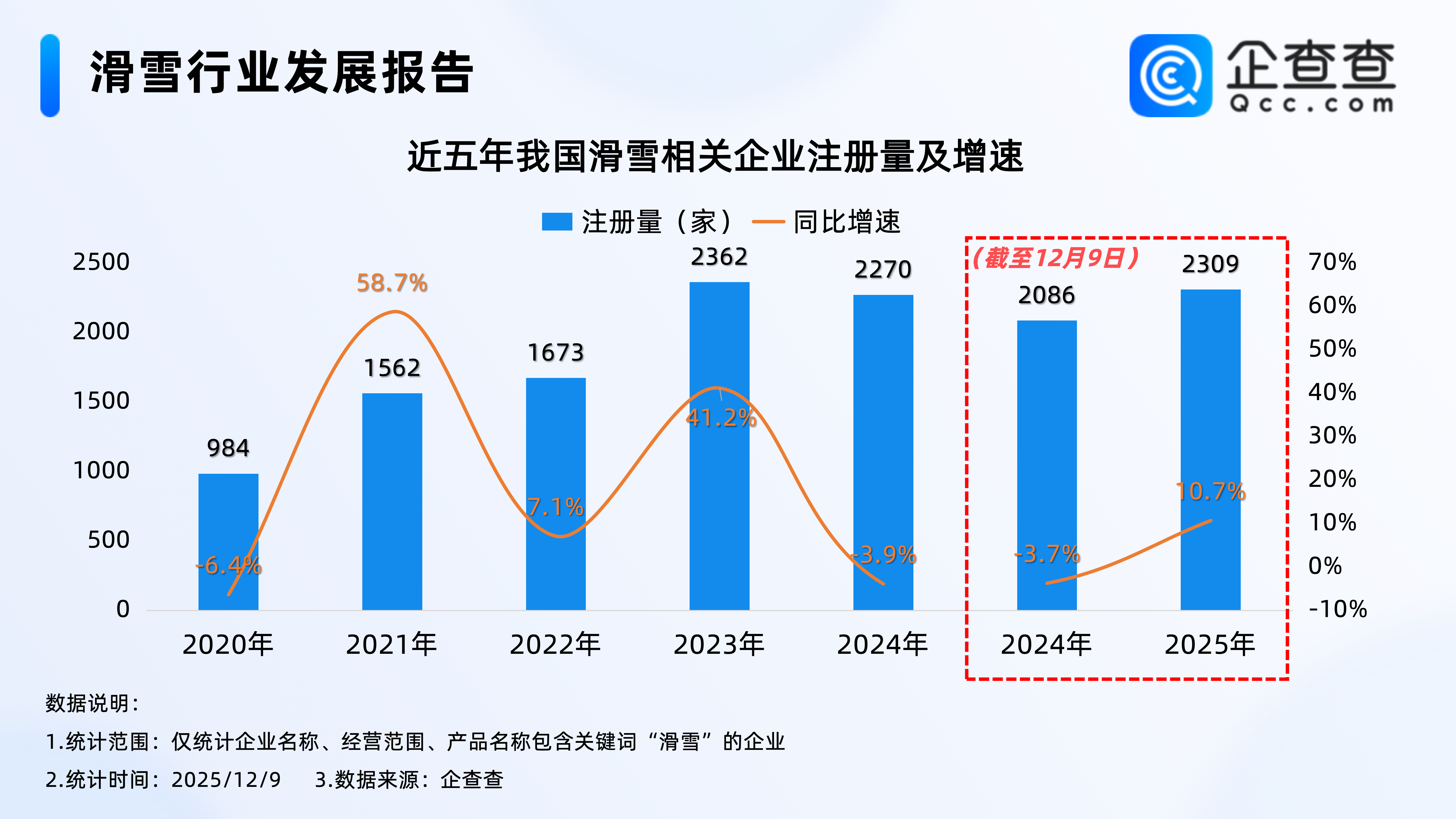 企查查数据显示,2020年以来,我国滑雪相关企业注册量整体稳步增加,2023年我国累计注册2362家滑雪相关企业,达近五年注册量峰值;截至12月9日,2025年我国已注册2309家滑雪相关企业,相比2024年同期增加10.7%。