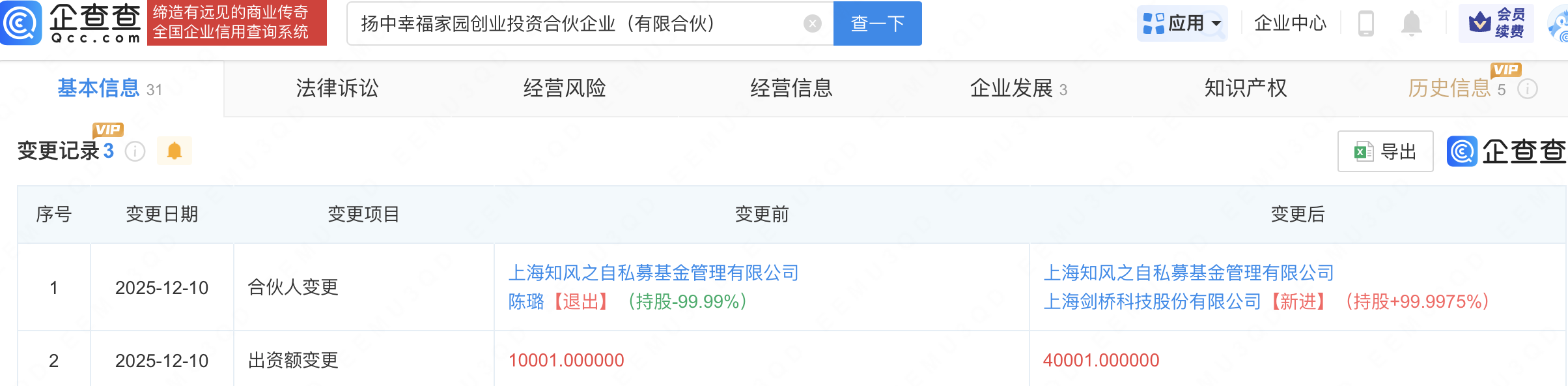 企查查APP显示,近日,扬中幸福家园创业投资合伙企业(有限合伙)发生工商变更,陈璐退出合伙人行列,新增剑桥科技(603083)为大股东,持股99.9975%。企查查信息显示,该企业成立于2025年10月,经营范围包含:创业投资(限投资未上市企业)。
