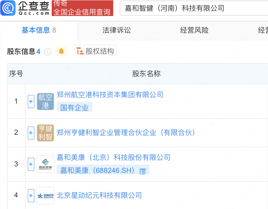 企查查APP显示,近日,嘉和智健(河南)科技有限公司成立,注册资本1亿元,经营范围包含:智能机器人的研发;人工智能基础软件开发;人工智能理论与算法软件开发;人工智能应用软件开发等。企查查股权穿透显示,该公司由嘉和美康(688246)、北京星动纪元科技有限公司等共同持股。
