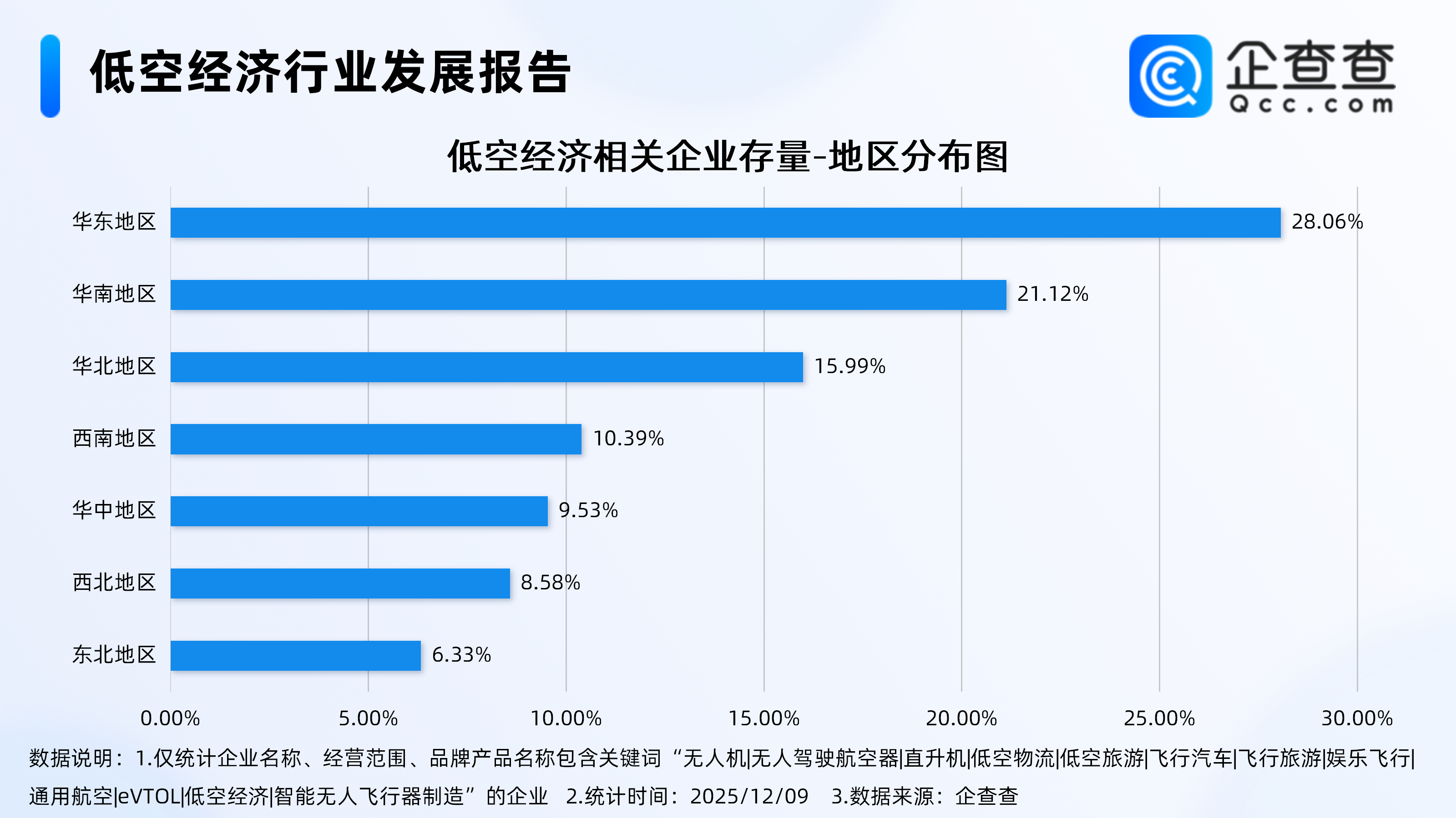 企查查数据显示,从地区分布来看,低空经济相关现存企业多分布在华东地区,占比28.06%。其次,分布在华南地区的相关企业占比21.12%。分布在华北地区、西南地区的相关企业分别占比15.99%、10.39%。其余地区相关企业存量占比均不足10%。