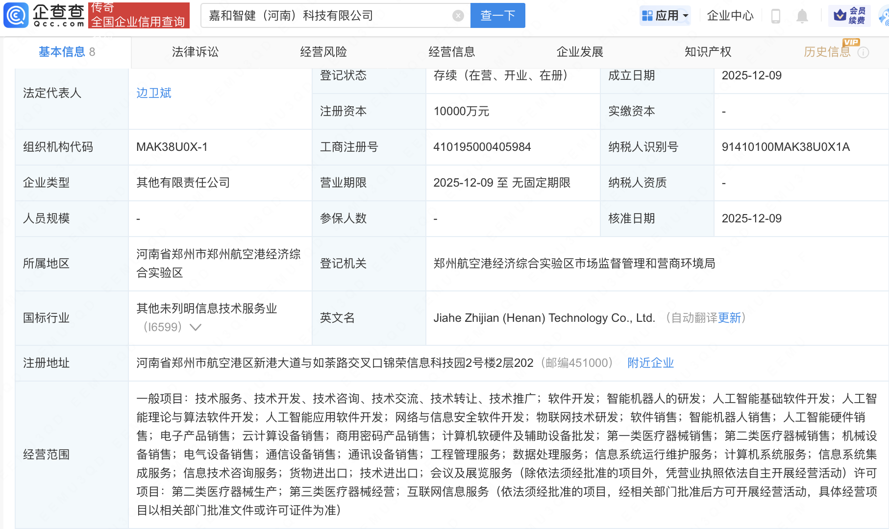 企查查APP显示,近日,嘉和智健(河南)科技有限公司成立,注册资本1亿元,经营范围包含:智能机器人的研发;人工智能基础软件开发;人工智能理论与算法软件开发;人工智能应用软件开发等。企查查股权穿透显示,该公司由嘉和美康(688246)、北京星动纪元科技有限公司等共同持股。