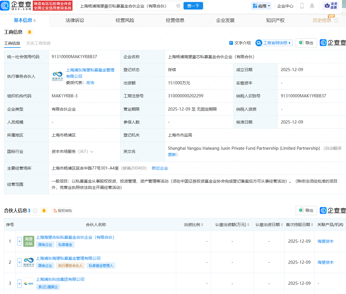 企查查APP显示,近日,上海杨浦海望鋆芯私募基金合伙企业(有限合伙)成立,出资额15.1亿元,经营范围包含:以私募基金从事股权投资、投资管理、资产管理等活动。企查查股权穿透显示,该基金由上海浦东海望私募基金管理有限公司、上海海望合纵私募基金合伙企业(有限合伙)、上海浦东科创集团有限公司共同出资。