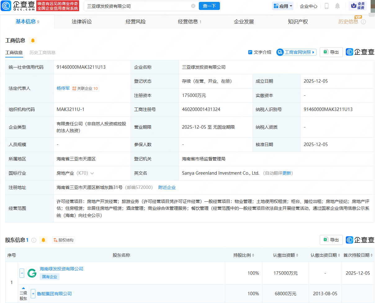 企查查APP显示,近日,三亚绿发投资有限公司成立,法定代表人为杨传军,注册资本为17.5亿元,经营范围包含:房地产开发经营;旅游业务;物业管理;土地使用权租赁;房地产经纪;商业综合体管理服务等。企查查股权穿透显示,该公司由鲁能集团旗下海南绿发投资有限公司全资持股。
