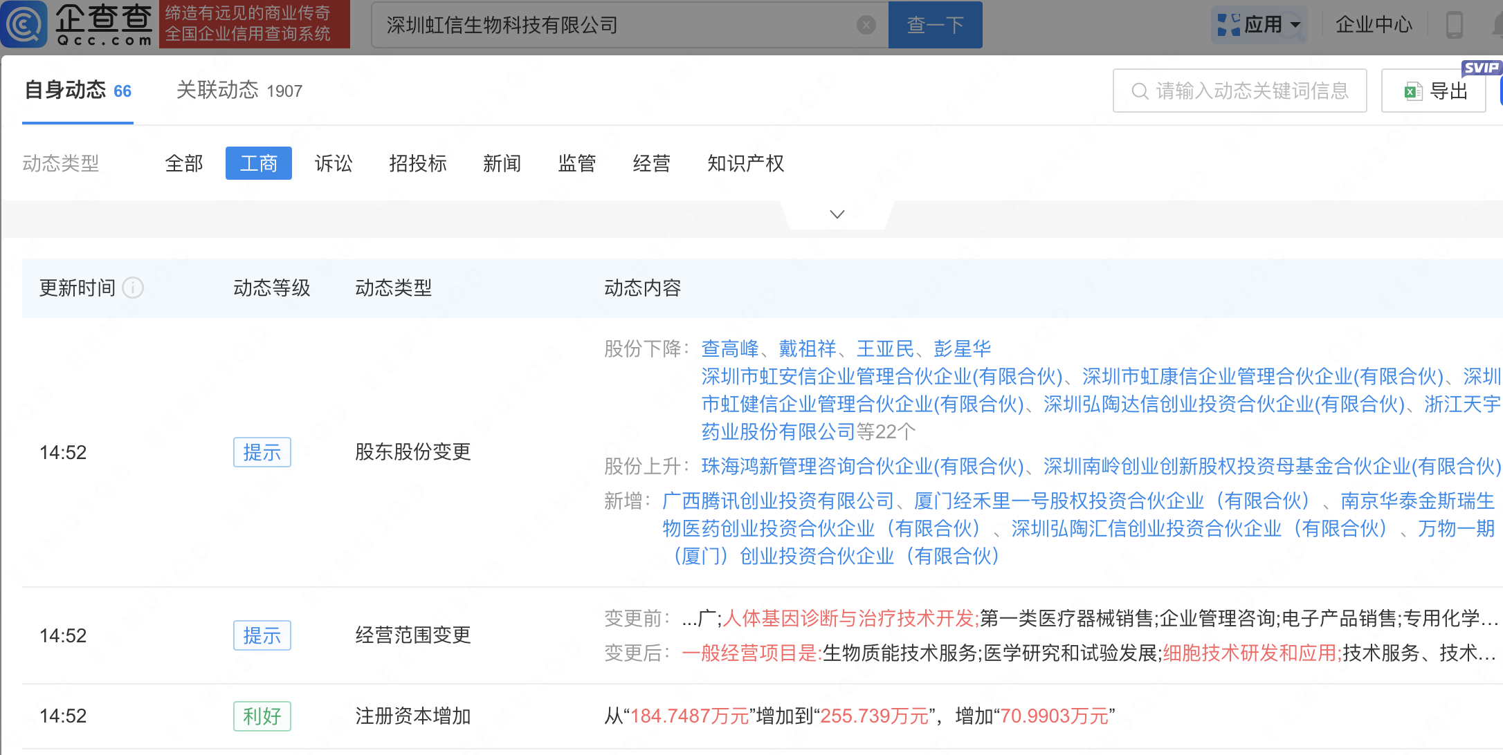 企查查APP显示,近日,深圳虹信生物科技有限公司发生工商变更,新增广西腾讯创业投资有限公司等为股东,同时注册资本增至255.739万元。企查查信息显示,该公司成立于2021年,经营范围包含:生物质能技术服务;医学研究和试验发展;细胞技术研发和应用等。据其官网,虹信生物是一家RNA创新药研发企业。
