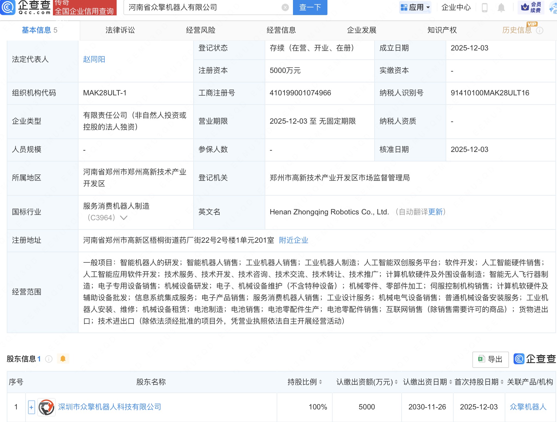 企查查APP显示,近日,河南省众擎机器人有限公司成立,法定代表人为赵同阳,注册资本5000万人民币,经营范围包括智能机器人的研发、智能机器人销售、工业机器人销售、工业机器人制造等。企查查股权穿透显示,该公司由深圳市众擎机器人科技有限公司全资持股。