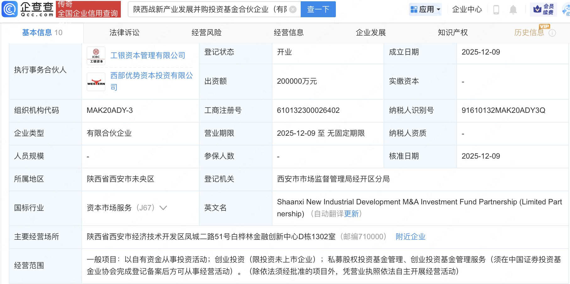 企查查APP显示,近日,陕西战新产业发展并购投资基金合伙企业(有限合伙)成立,出资额20亿元,经营范围包含:以自有资金从事投资活动;创业投资(限投资未上市企业);私募股权投资基金管理、创业投资基金管理服务。企查查股权穿透显示,该企业由西部证券(002673)全资子公司西部优势资本投资有限公司、陕西省人民政府国有资产监督管理委员会旗下长安汇通集团有限责任公司、工银金融资产投资有限公司等共同出资。