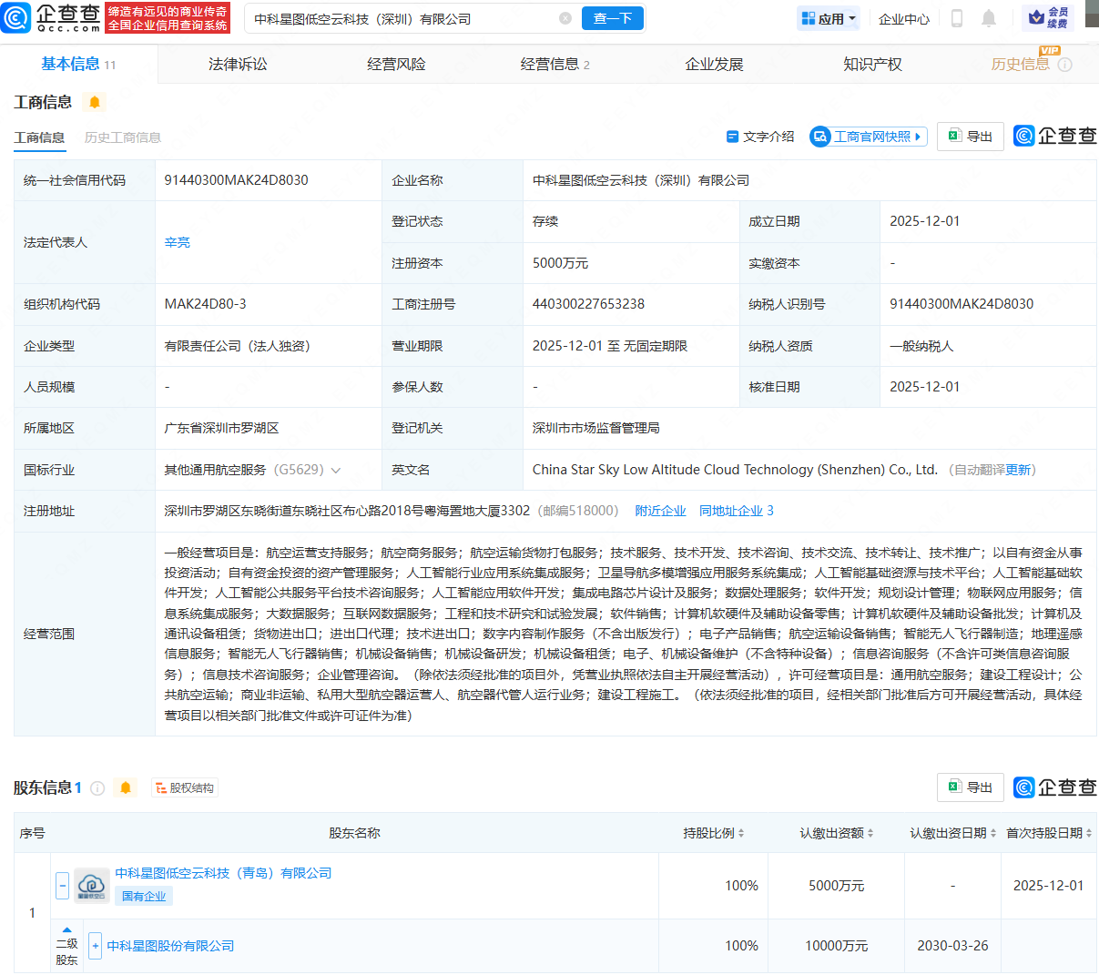 企查查APP显示,近日,中科星图低空云科技(深圳)有限公司成立,法定代表人为辛亮,注册资本为5000万元,经营范围包含:航空运营支持服务;航空商务服务;航空运输货物打包服务;人工智能基础软件开发;智能无人飞行器制造等。企查查股权穿透显示,该公司由中科星图(688568)间接全资持股。