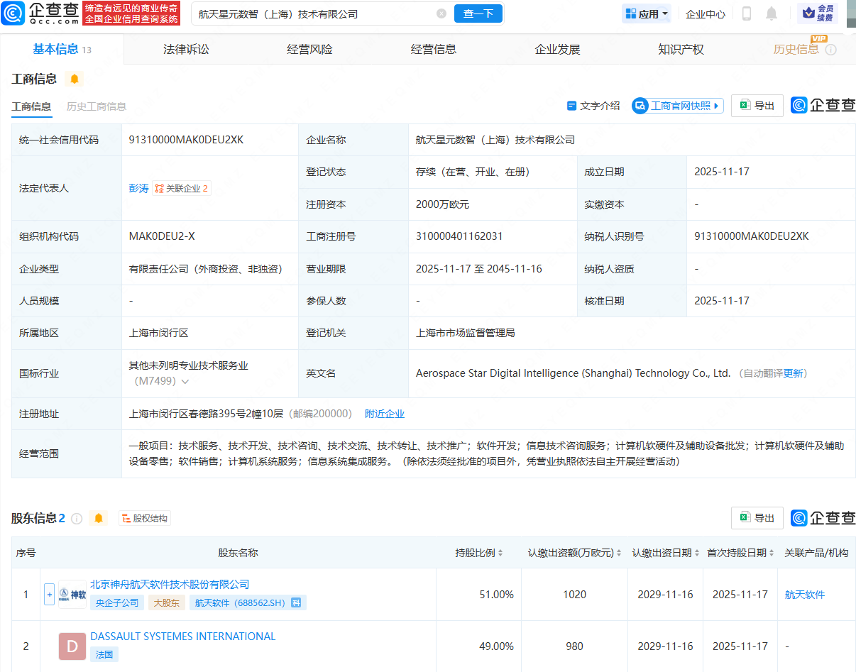 企查查APP显示,近日,航天星元数智(上海)技术有限公司成立,法定代表人为彭涛,注册资本为2000万欧元,经营范围包含:信息技术咨询服务;计算机软硬件及辅助设备批发;计算机软硬件及辅助设备零售;软件销售等。企查查股权穿透显示,该公司由航天软件(688562)、DASSAULT SYSTEMES INTERNATIONAL共同持股。