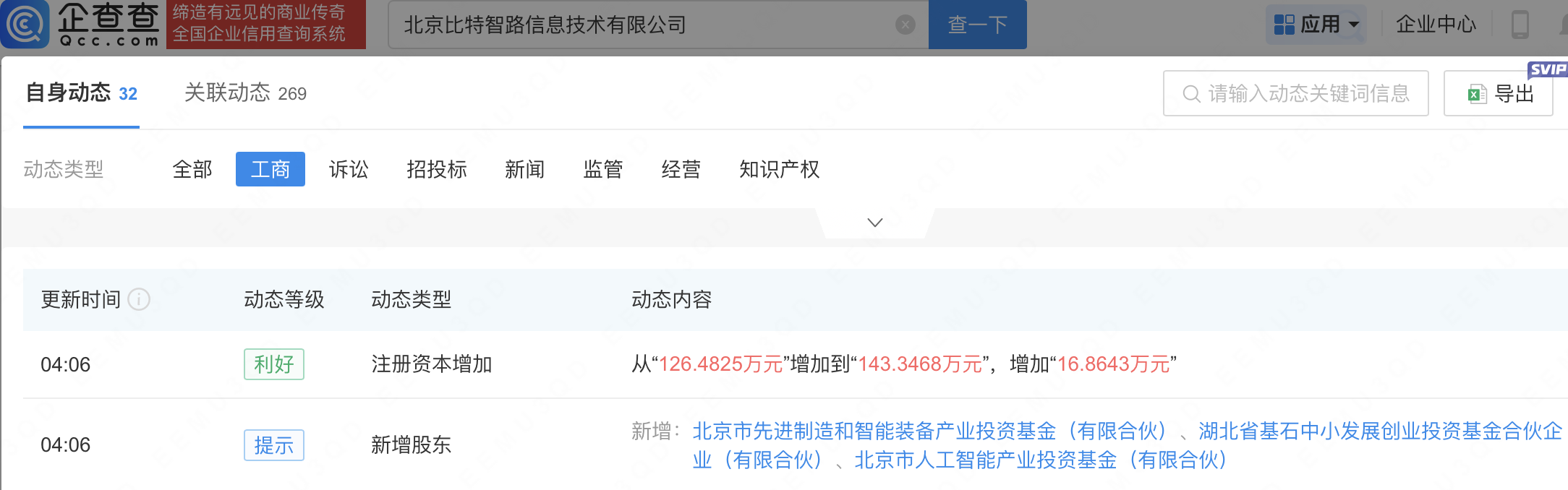 企查查APP显示,近日,北京比特智路信息技术有限公司发生工商变更,新增北京市人工智能产业投资基金(有限合伙)、北京市先进制造和智能装备产业投资基金(有限合伙)等为股东,同时注册资本增至143.35万元。企查查信息显示,该公司成立于2023年,法定代表人为郭传雄,经营范围包含:集成电路设计;软件开发;网络与信息安全软件开发;人工智能基础软件开发等。公开信息显示,该公司致力于通过端到端的方式解决人工智能基础设施所面临的网络可扩展性和通信效率问题。