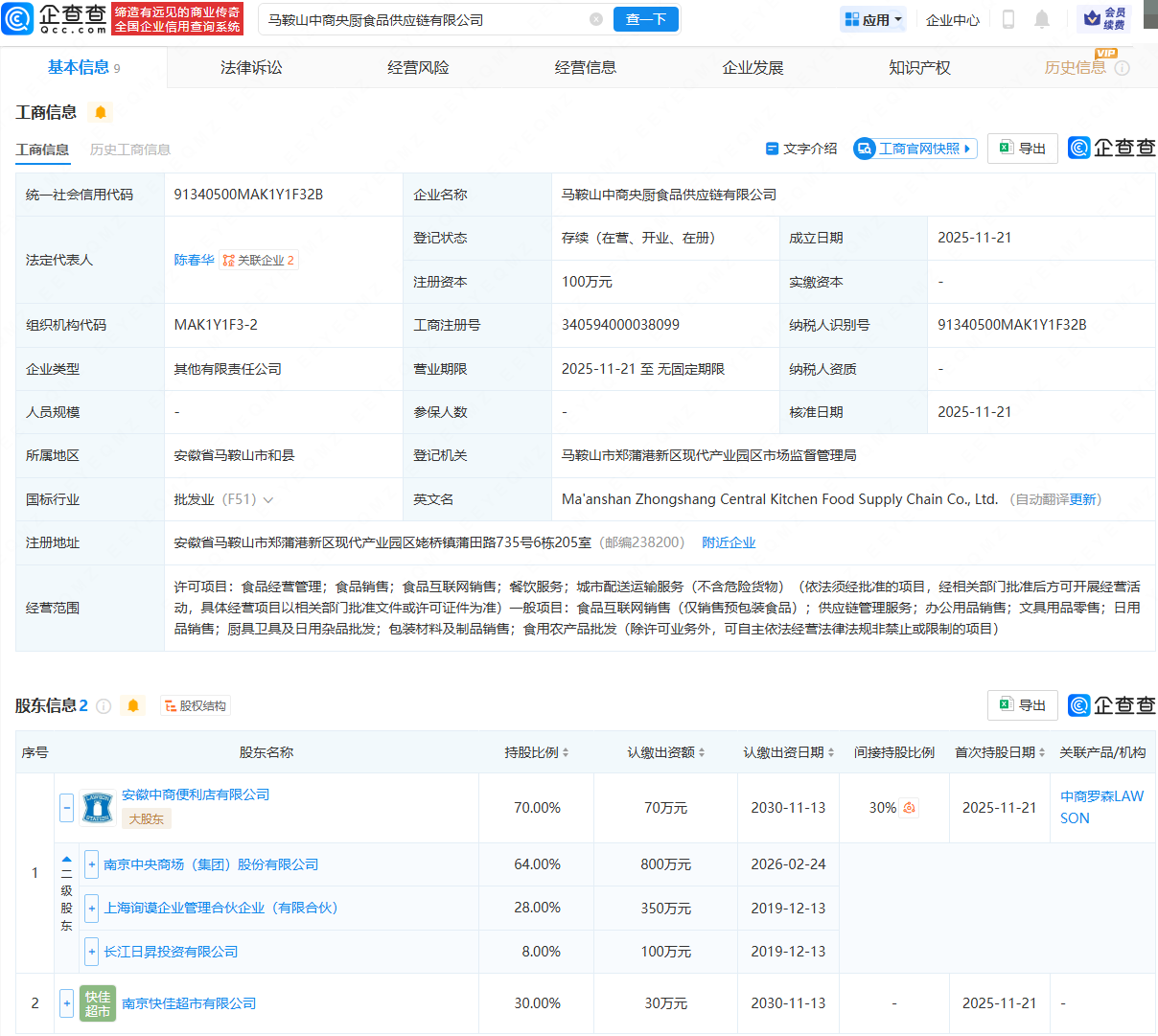企查查APP显示,近日,马鞍山中商央厨食品供应链有限公司成立,法定代表人为陈春华,经营范围包含:食品经营管理;食品销售;食品互联网销售;餐饮服务;城市配送运输服务;供应链管理服务等。企查查股权穿透显示,该公司由中央商场(600280)旗下安徽中商便利店有限公司、南京快佳超市有限公司共同持股。