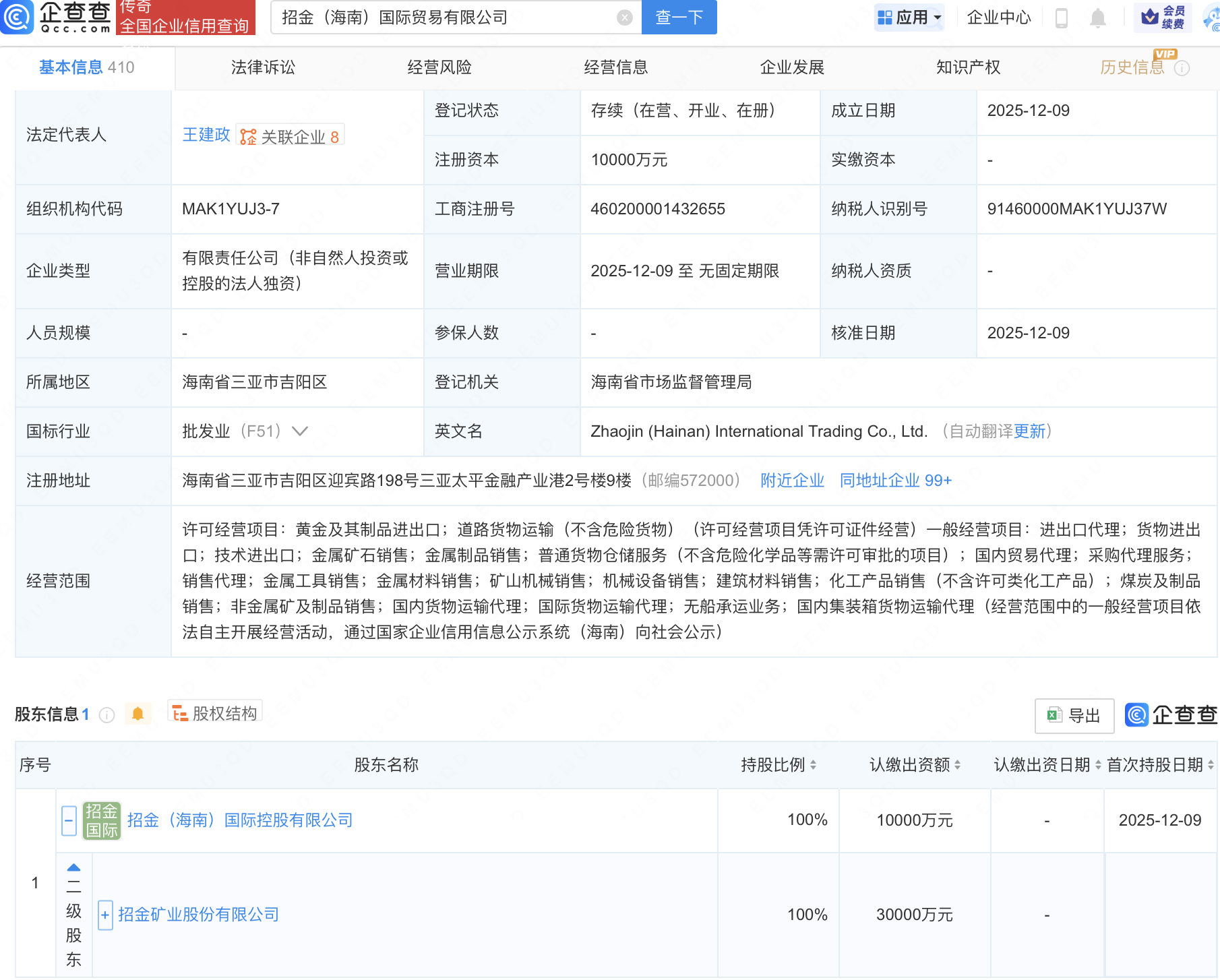 招金矿业在海南新设国际贸易公司,注册资本1亿元