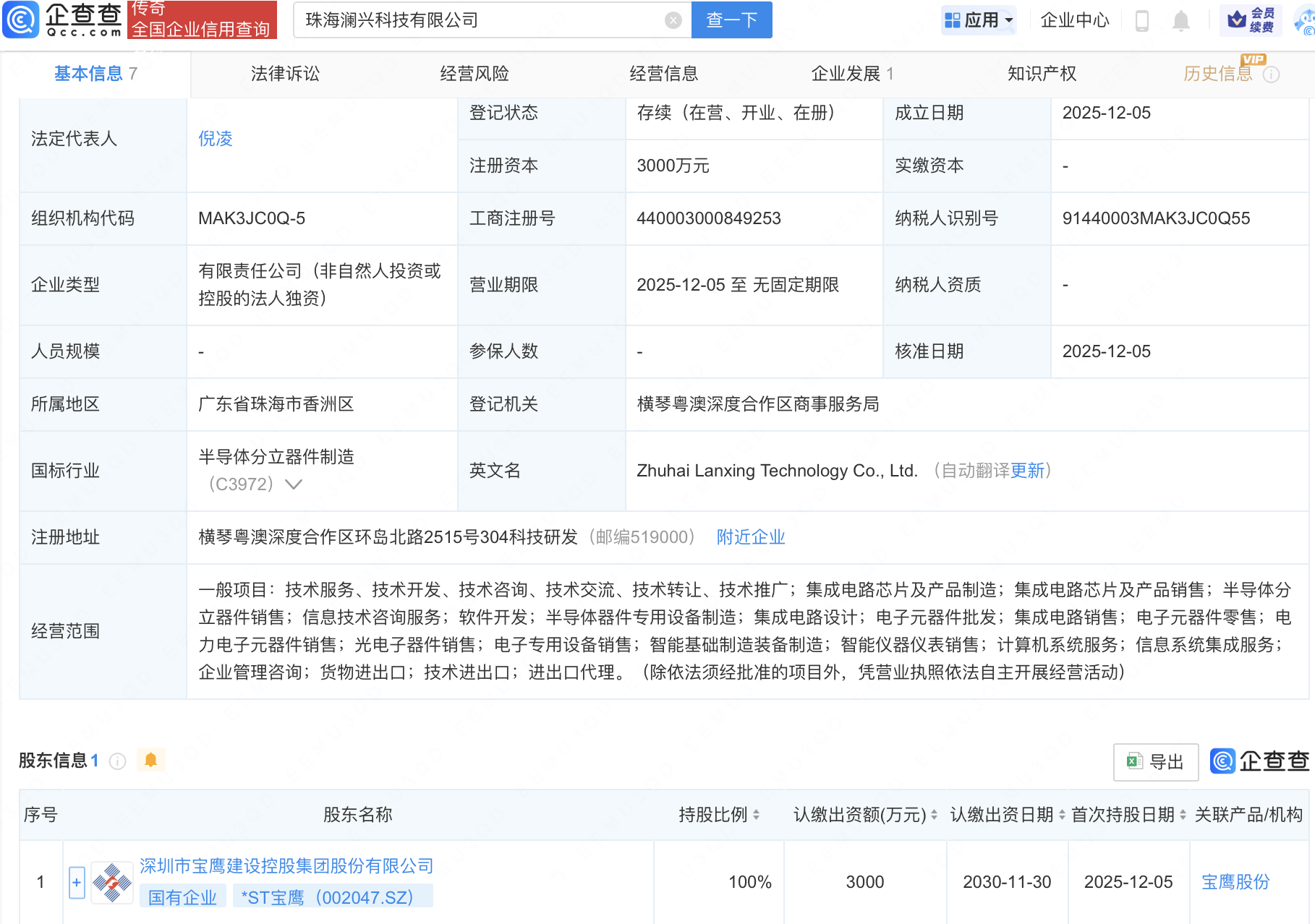 企查查APP显示,近日,珠海澜兴科技有限公司成立,注册资本3000万元,经营范围包含:集成电路芯片及产品制造;集成电路芯片及产品销售;半导体分立器件销售;半导体器件专用设备制造等。企查查股权穿透显示,该公司由*ST宝鹰(002047)全资持股。
