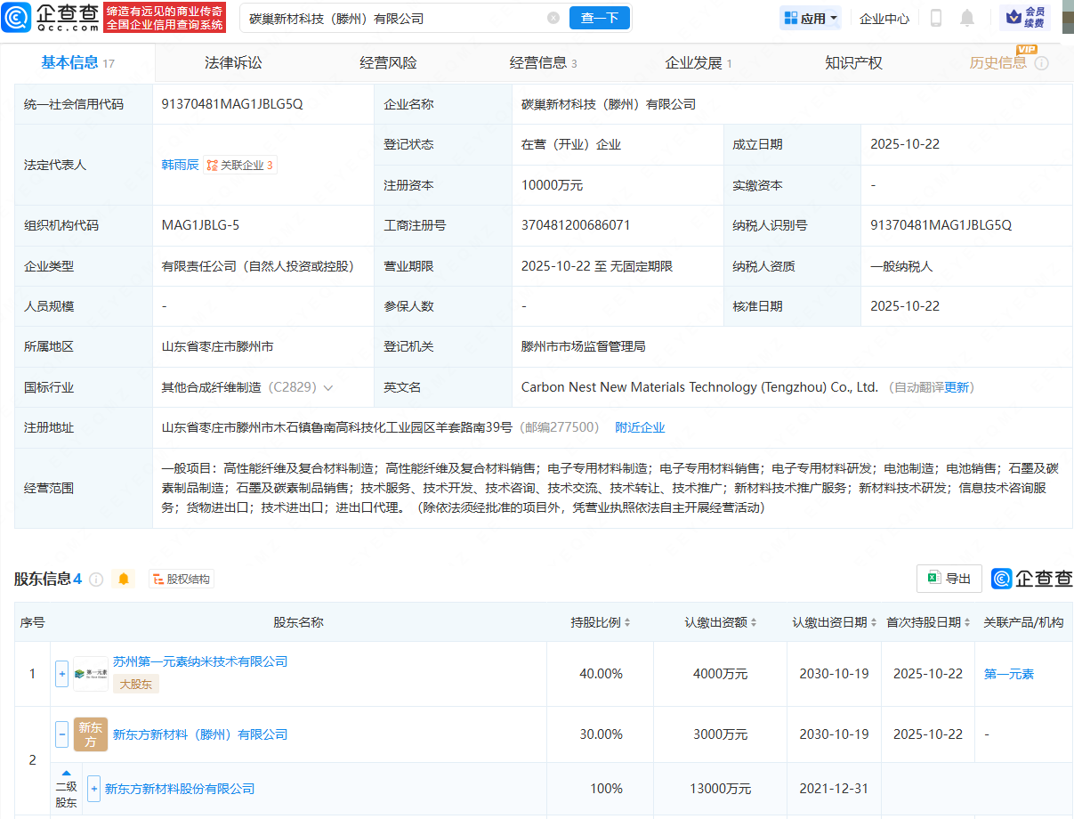 企查查APP显示,碳巢新材科技(滕州)有限公司成立,法定代表人为韩雨辰,注册资本为1亿元,经营范围包含:高性能纤维及复合材料制造;电子专用材料制造;电子专用材料研发;电池制造;石墨及碳素制品制造等。企查查股权穿透显示,该公司由苏州第一元素纳米技术有限公司、东方材料(603110)全资子公司新东方新材料(滕州)有限公司等共同持股。