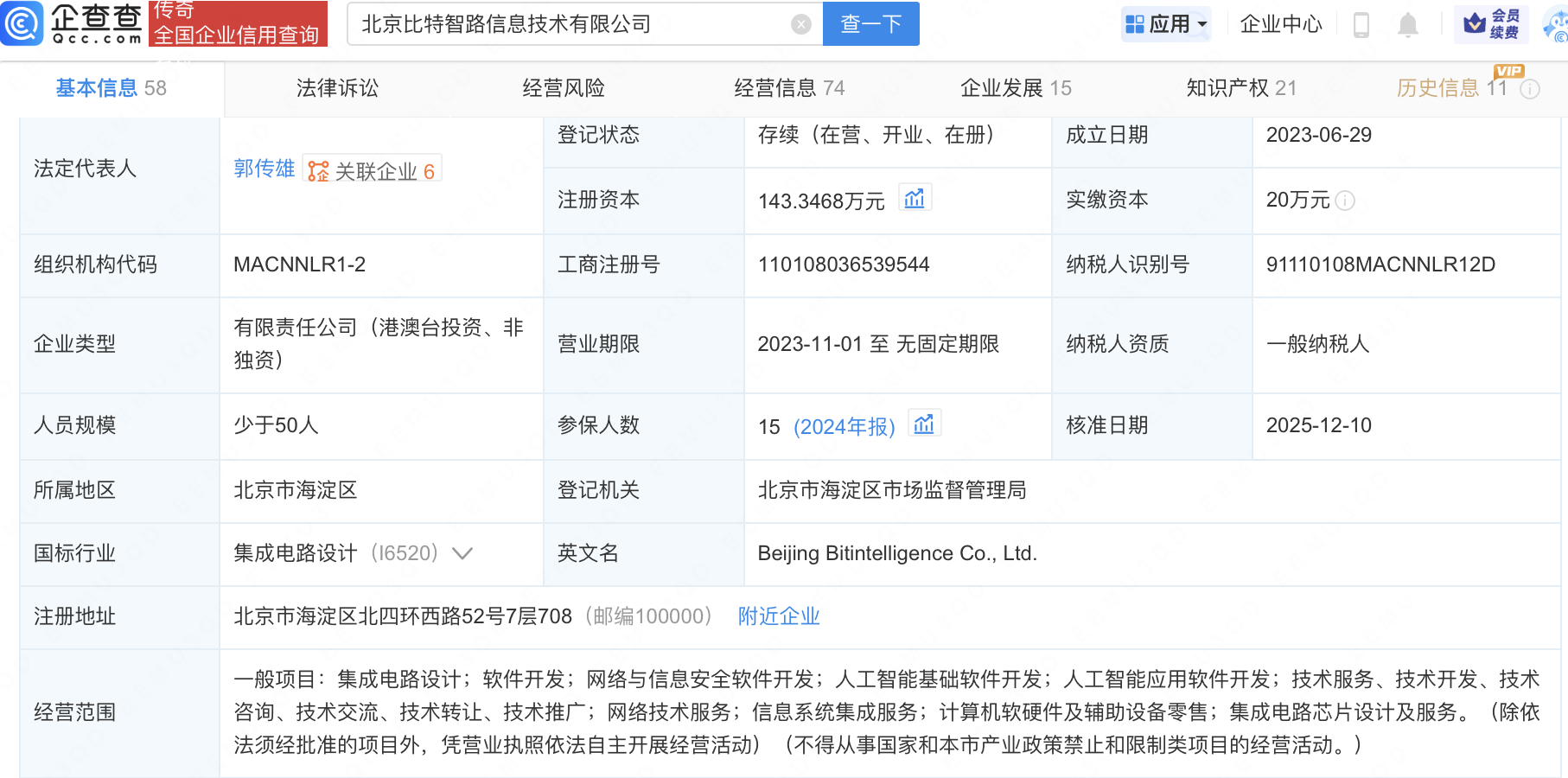 企查查APP显示,近日,北京比特智路信息技术有限公司发生工商变更,新增北京市人工智能产业投资基金(有限合伙)、北京市先进制造和智能装备产业投资基金(有限合伙)等为股东,同时注册资本增至143.35万元。企查查信息显示,该公司成立于2023年,法定代表人为郭传雄,经营范围包含:集成电路设计;软件开发;网络与信息安全软件开发;人工智能基础软件开发等。公开信息显示,该公司致力于通过端到端的方式解决人工智能基础设施所面临的网络可扩展性和通信效率问题。